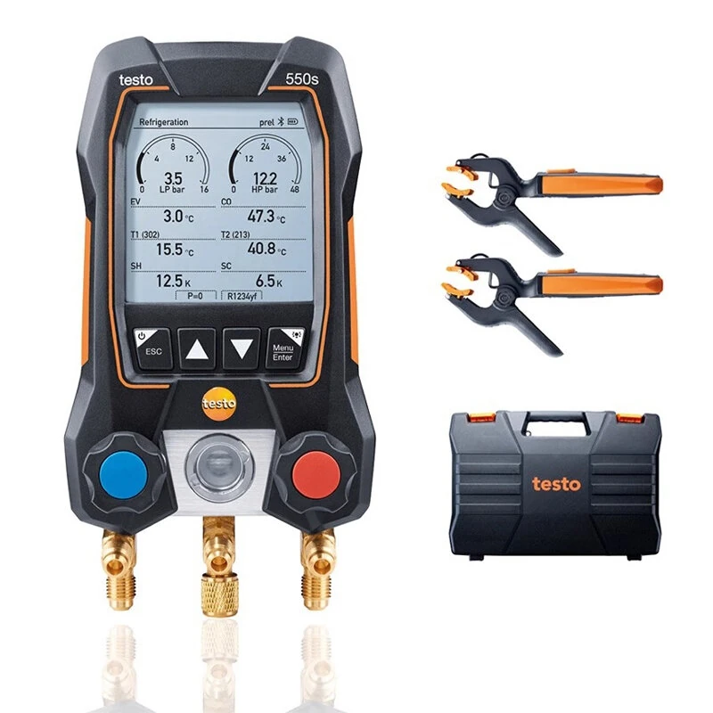 المواصفات:قياس الضغط:نطاق القياس: -1 إلى 60 بارالدقة: ±0.5% من المقياس الكاملالدقة: 0.01 بارمنفذ الاتصال: 1/4'' SAEأقصى ضغط تحميل: 65 بارقياس الفراغ:نطاق القياس: من 0 إلى 20,000 ميكرومترالدقة: ±(10 ميكرومتر + 10% من القراءة)الدقة: 1 ميكرومتر(0-1,000 ميكرومتر),10 ميكرومتر(1,000-2,000 ميكرومتر),100 ميكرومتر(2,000-5,000 ميكرومتر)منفذ الاتصال: 1/4'' SAEقياس الحرارة:نطاق القياس: -50 درجة مئوية إلى +150 درجة مئويةالدقة: ±0.5°مالقرار: 0.1 درجة مئويةمنفذ الاتصال: 2 × توصيل (NTC)معلومات عامة:درجة حرارة التشغيل: -20°C إلى +50°Cدرجة حرارة التخزين: -20°C إلى +60°Cمصدر الطاقة: 4 بطاريات AAعمر البطارية: 250 ساعة (بلوتوث والإضاءة الخلفية مغلقة)، 100 ساعة (بلوتوث والإضاءة الخلفية مفتوحة)نطاق البلوتوث: 150 مترفئة الحماية: IP54الميزات:1.تشخيص التبريد وHVAC الدقيقتوفر جهاز testo 550s قياسات دقيقة جدًا للضغط ودرجة الحرارة، مما يدعم التحليل الدقيق والتعديلات لأنظمة التبريد وتكييف الهواء.2. قياس الفراغ المتقدمتضمن قدرات قياس الفراغ المتكاملة إخلاء النظام بشكل موثوق وفعال بدقة على مستوى الميكرومتر، مما يعزز الأداء المُحسن للتطبيقات التي تتطلب ذلك.3. اتصال لاسلكي في الوقت الحقيقيمزود بتقنية البلوتوث ومدى قوي يبلغ 150 مترًا، مما يتيح المراقبة السلسة ونقل البيانات إلى التطبيق المخصص لتحسين كفاءة سير العمل.4.تصميم سهل الاستخدامتُبسط الشاشة الكبيرة المضاءة من الخلف والواجهة البديهية عملية التنقل، مما يوفر بيانات النظام الأساسية نظرة سريعة تحت ظروف الإضاءة المختلفة.5. حماية متينة IP54تم تصميمه لتحمل البيئات الصعبة، يوفر غلاف تصنيف IP54 حماية موثوقة ضد الغبار ودخول المياه.الحزمة تشمل:النوع A:1 x 550s مق