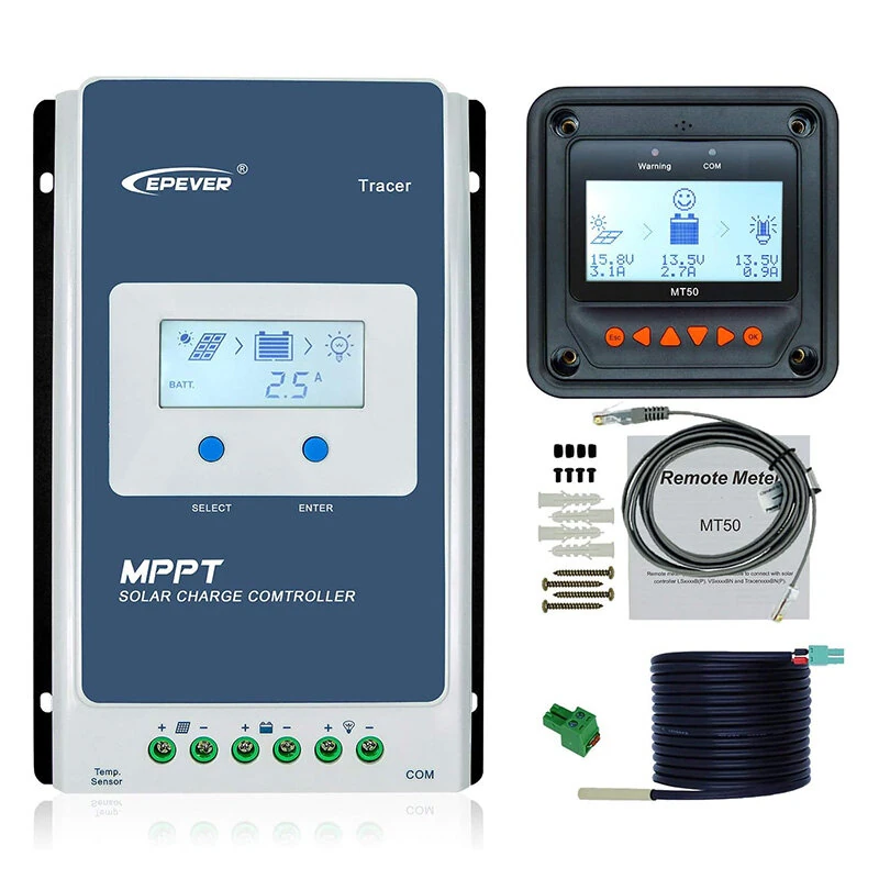 사양:제품명MPPT 태양광 컨트롤러모델Tracer 2210ANTracer 3210AN트레이서 4210AN{"Rated voltage"}12/24VDC (자동 식별)등급별 충전 전류20A30A40A만점 방전 전류20A30A40A컨트롤러 작동 전압 범위8~32V8~32V8~32V최대 PV 개방 회로 전압100V (최소 온도 25℃)MPP 작동 전압 범위(배터리 전압 + 2V)~72V최대 PV 입력 전력260W/12V390W/12V520W/12V520W/24V780W/24V1040W/24V정전손≤12mA방전 회로 전압 강하≤0.23V온도 보상 계수-3mV/℃/2V (기본값)접지형부정적 접지RS485 통신 인터페이스5VDC/100mALCD 백라이트 시간60S (기본값)작업 환경 온도25℃~+50℃ (풀로드 작업)저장 온도-20℃~+70℃상대 습도≤95%, 응축 없음보호 수준IP30 특징: ● 12V/24V 자동 제어 시스템은 기술 전력과 전류가 정격값을 초과하지 않도록 제어합니다.●LCD 디스플레이 및 백라이트 디자인은 운영 데이터와 작동 상태를 동적으로 표시하여 편리하게 확인할 수 있습니다.추적 효율은 99.5 % 이상이며 최대 전환 효율은 98%입니다.●다양한 상황에서 다양한 통신 요구 사항을 충족시키기 위해 PC(Windows 전용) 소프트웨어, 앱 및 MT-50을 지원합니다● 납산 건전지용 배터리 온도 보상 기능으로, 배터리를 보호하여 레귤레이터의 수명을 보장합니다.태양 전하 초과와 방전 초과●공통 음극 설계, 다중 부하 제어 모드 (수동 모드, 라이트 ON/OFF, 라이트 ON + 타이머 및 테스트 모드)패키지에 포함된 내용 (선택 사항):1 개의 MPPT 태양광 충전 컨트롤러 (Tracer2210AN / 3210AN / 4210AN)또는 1 x 리모컨 미터 MT50또는 1 x 온도 센서 케이블(RTS300R47K3.81A)또는 Bluetooth 모듈 1개또는 1 x WIFI 2.4G또는 1 x RS485 케이블1 x 사용자 매뉴얼(주문은 선택된 액세서리에 따라 배송됩니다.)