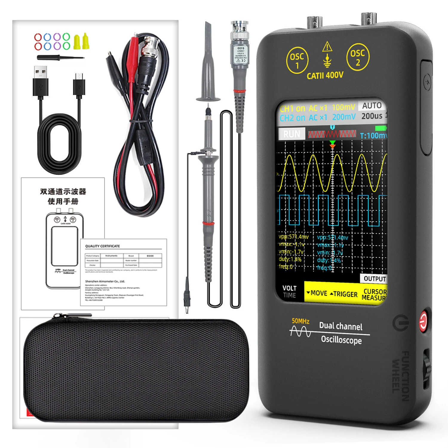 Özellikler:Çift Kanal Gerçek Zamanlı Örnekleme: 50MHz bant genişliği ve 250MSa/s örnekleme hızı ile çift kanal DC ve AC gerçek zamanlı örneklemeyi destekler. Dokunmatik Ekran Konforu: Kullanıcı dostu bir arayüz sağlayan 3.98 inç TFT LCD dokunmatik ekran ile donatılmıştır; bu, kolay gezinme ve işlem sağlar. Çok yönlü Dalga Üreteci: Sinüs,kare,üçgen ve testere dişi dalgalarını destekleyen yerleşik sinyal üreteci,0Hz ila 2MHz frekans aralığına sahiptir. Veri Saklama ve Düşük Pil Uyarısı: Veri saklama işlevselliği,düşük pil uyarısı,otomatik kapanma ve kullanım kolaylığını artırmak için ekran arka aydınlatması içerir. Kompakt ve Taşınabilir Tasarım: Hafif (pil dahil 268g) ve kompakt (170.0x80.9x23.9mm),kolaylık ve taşınabilirlik için 3000mAh lityum batarya ile çalışır. Özellikler:Ekran: 3.98 inç TFT LCD ile Kapasitif DokunmatikÖrnekleme hızı: 250MSa/sBant genişliği: 50MHzKanallar: 2 (DC/AC)Pil: 3000mAh lityum pilBoyut: 170.080.923.9mmAğırlık: 268g (pil ile)Dalga Biçimleri: Sinüs,Kare,Üçgen,Testere,DCFrekans Aralığı: 0Hz ~ 2MHz Paket içeriği:1 x Çift kanallı osiloskop-O2 ana unit1 x 10X osiloskop probu1 x Kırmızı ve siyah timsah klips probu1 x USB Type-C kablo1 x EVA depolama çantası1 x Osiloskop kılavuzu1 x Ürün Sertifikasımso-bidi-font-family:'Times New Roman';font-size:10.5000pt;mso-font-kerning:1.0000pt;