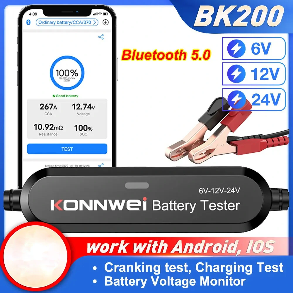 مختلف عن أساليب الاختبار التقليدية. يعتمد KONNWEI BK100/BK200 أحدث تقنية بلوتوث لاختبار بطارية السيارة، لم تعد تحتاج للوقوف أمام السيارة والانتظار لعملية الاختبار، بعد توصيل بطارية السيارة، يمكنك فتح التطبيق على هاتفك/جهازك اللوحي لأداء اختبار بطارية السيارة، وهو سهل الاستخدام وصديق للعميل.المواصفات:علامة تجارية: KONNWEIالنموذج: BK100 BK200نطاق اختبار BK100: 6V 12Vمدى اختبار BK200: 6V 12V 24VBK100: دعم بطارية 6V 12VBK200: دعم بطارية 6V 12V 24Vمتوافق مع بطاريات المركبات والدراجات النارية وسفن البخار التي تعمل بجهد 6 فولت - 12 فولت - 24 فولت. بما في ذلك بطارية الرصاص - حمض العادية، بطارية الصفائح المسطحة AGM، بطارية الأسماك ACM، وبطارية الجل وغيرها.الميزات:يدعم KONNWEI BK100 BK200 13 لغة:KONNWEI BK100 BK200 تدعم اللغات الصينية والإنجليزية والألمانية والفرنسية واليابانية والهولندية والروسية والإسبانية والإيطالية والكورية والبرتغالية والبولندية والفارسية. اللغة الفعلية تعتمد على إعدادات لغة نظام هاتفك / جهاز التابلت. ستتبع عرض اللغة تغيير لغة نظامك.عدة أجهزة عبر الإنترنت في نفس الوقت:ما عليك سوى النقر على الرمز في الزاوية العلوية اليسرى للتطبيق لتحديده.3. نتيجة اختبار المشاركة بمفتاح واحدما عليك سوى النقر على أيقونة المشاركة لإنشاء تقرير المشاركة.4. التحديث المجاني عبر الإنترنتمسح رمز الاستجابة السريعة على ظهر المنتج لتنزيل البرنامج، ويمكن تحديث برامج الأجهزة البرمجية في أي وقت وفي أي مكان. مع مقياس بطارية السيارات KONNWEI BK100 BK200 ، يمكننا فحص الصحة العامة للبطارية ، بما في ذلك اختبار التشغيل وتشغيل اختبار الشحن الكامل للنظام.اختبار الدوراناختبار الدوران هو اختبار وتحليل محرك