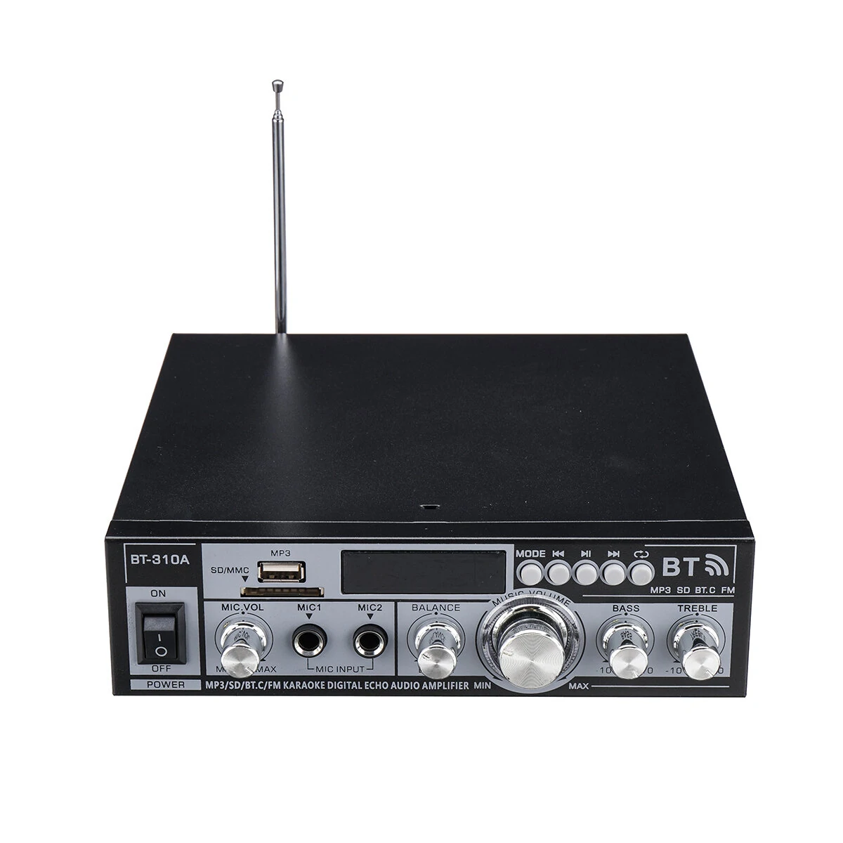 Specificazione:Tipo di amplificatore: HIFIAmplificatore Canale: 2.0Tensione di ingresso: 110V- presa US/ 220V- presa EUPotenza di uscita: 60W * 2Impedenza di uscita: 4-160 ohmDistorzione armonica: Controllo dell'altoparlante: 10KHz ± 12dB, 220mV, 47K ohmControllo dei Bassi: 100Hz ± 12dB, 220mV, 47K ohmIntervallo di risposta in frequenza: 20Hz - 20KHzCompatibilità Bluetooth: Supportata (Versione 5.0)Supporto USB: SìSupporto scheda SD: SìSupporto microfono: SìRadio FM: SupportataIntervallo di frequenza FM: 87,5 MHz - 108 MHzTelecomando: InclusoDimensioni del prodotto: 19,3 cm x 20 cm x 5,5 cmPeso: 1.7kgCaratteristiche:Audio potente: L'amplificatore BT310A per la casa offre una potenza di uscita combinata di 120W (60W x 2), garantendo un'esperienza audio ricca e coinvolgente per il tuo sistema home theater o audio per auto.Connessione flessibile: con il supporto Bluetooth 5.0, USB e scheda SD, puoi facilmente collegare i tuoi dispositivi e goderti la tua musica preferita senza interruzioni. La radio FM integrata amplia le tue opzioni di intrattenimento.3. Controllo migliorato: Regola l'audio secondo le tue preferenze con le manopole di controllo dei toni alti e bassi dedicate. Ottieni il bilanciamento perfetto per la tua musica e goditi un'esperienza di ascolto personalizzata.4. Supporto per il microfono: Questo amplificatore è dotato di due ingressi per microfono, che ti permettono di ospitare sessioni di karaoke o fare annunci durante raduni, feste o eventi.5. Telecomando como