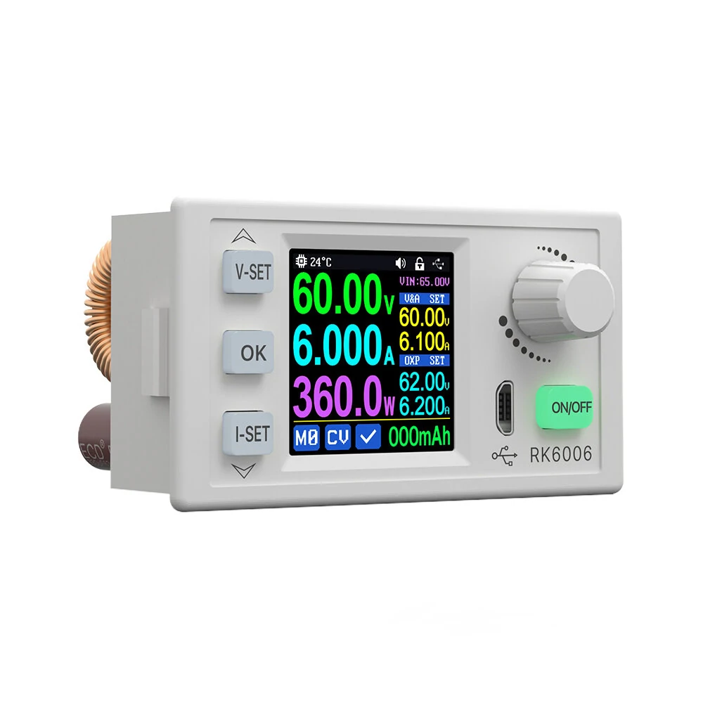 사양:모델RK6006/RK6006-BT입력 전압 범위12-68.00V출력 전압 범위0-60.00V현재 범위 출력0-6.000A출력 전력 범위0-360W입력 전압 측정 해상도0.01V출력 전압 설정 측정 분해능0.01V현재 설정된 측정 해상도 출력0.001A입력 전압 측정 정확도± (1%+5 자릿수)설정 및 측정 사이의 출력 전압 정확도+/- (0.3% + 3 자리)설정과 측정 사이의 현재 정확도 출력±(0.5%+5 자릿수)출력 리플 일반적인100mV VPP①작업 온도 범위-10℃~40℃외부 센서 온도 범위-10℃~100℃/0℉~200℉외부 센서 온도 정확도±3℃/±6℉일정 전압 모드 응답 시간2ms (0.1A-5A 부하)일정한 전압 모드 부하 조절±(0.1%+2 자릿수)일정한 전류 모드 부하 규정±(0.1%+3 자릿수)용량 측정 범위0-9999.99Ah에너지 측정 범위0-9999.99Wh용량 및 에너지 통계 오류±2%버크 작업 모드(입력 전압÷1.1)-1②과열 보호시스템 온도>80℃화면 밝기 설정0-5 (총 6 단계)화면1.54인치 240*240 컬러 HD 디스플레이냉각 팬 시작 조건현재 출력 > 4A 또는 시스템 온도 > 45℃냉각 팬 종료 조건현재 출력은 ℃무게 (포장 포함)약 0.15kg제품 크기79 x 43 x 54mmUSB 통신 지원예블루투스 통신 지원:RK6006-BT만 지원됩니다① 리플 측정 방법: 0.1uF 병렬 커패시터를 출력 단자에 연결하여 오실로스코프에서 X1 범위, 교류 커플링, 20MHz 대역폭에서 노이즈와 리플을 측정합니다.② 예를 들어, 입력 전압은 24V입니다,최대 출력 전압은 20.8V입니다 특징:RK6006은 펌웨어 업그레이드를 지원하여 새로운 기능을 추가하고 제품이 더욱 강력해질 수 있습니다보다 편리하게 PC, 휴대전화, 앱으로 다중 작업을 제어할 수 있습니다1.54인치 LCD 디스플레이 화면, 더 큰 화면, 240*240P 더 높은 디스플레이 해상도더 높은 범위, 전압/전류 더 높은 출력. 출력 전압 060.00V, 출력 전류 0-6.000A, 4자리 디스플레이360° 회전 스크린. 언제나 최상의 시야각을 유지하며 측정 데이터를 어떤 각도에서도 읽을 수 있습니다참고:1. RK6006 메뉴얼, PC 소프트웨어, 앱 다운로드 링크2. IOS 앱 다운로드: APP STOR에서 "RUIDENG" 검색안드로이드 어플리케이션 다운로드 링크포함된 패키지:RK6006 1 x RK6006 USB 통신 1 x 10A 퓨즈 RK6006-BT 1 개의 RK6006-BT USB + BT 통신 1 x 블루투스 보드 1 x 10A 퓨즈 1 x 외부 온도 센서