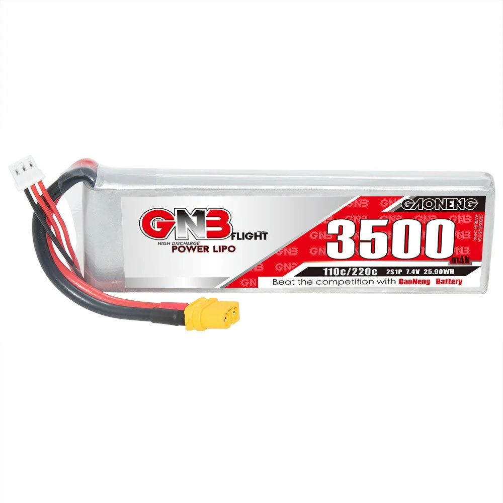 Spécifications détaillées:Marque: GaonengModèle n° : GNB35002S110ACapacité : 3500mAhTension: 7.4VConfiguration des cellules: 2S1PDimensions du colis : 15*44*138mm(H*L*L)Poids net: 197g (+/-10g)Taux de décharge: 110CTaux de charge: de 1C à 5CConnecteur de décharge: fiche XT60/TNote: En raison de la différence entre la mesure, les dimensions et le poids de la batterie peuvent présenter une petite erreur.Attention:Ne surchargez pas ou ne déchargez pas excessivement les batteries.Ne le mettez pas à côté d'une température élevée.Ne le jetez pas dans le feu.Ne le jetez pas dans l'eau.Forfait inclus:1x Batterie LiPo GAONENG GNB 7,4V 3500mAh 110C 2S