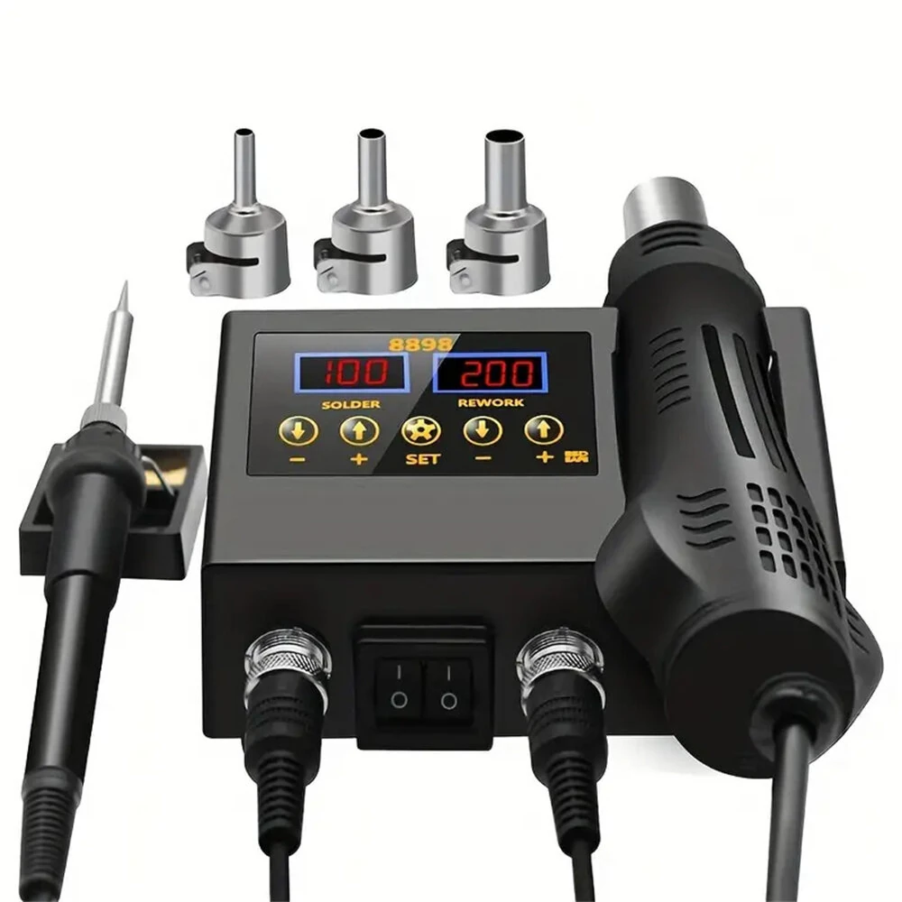 사양:모델: 2 in 1 SMD 납땜 스테이션열풍기 작동 전압: AC110V출력 전력: 100-700W온도 범위: 100°C~480°C온도 안정성: ±2℃공기 유량: 150L/min (최대)납땜 인두 온도 범위: 조정 가능디지털 디스플레이: 듀얼 LCD소음 수준: 매우 낮음공간 절약형 디자인냉각 기능: 자동옵션 플러그 유형: EU 플러그 / US 플러그 특징:{"이중 기능"} Combines hot air heater and soldering iron into one rework station, efficiently saving space and resources.[정밀 온도 제어] 듀얼 LCD 디지털 디스플레이는 핫 에어 건과 납땜 인두 모두에 대해 정확한 온도 조정을 제공합니다.[지능형 안전 기능] 더 안전한 개인 작업과 히터 수명 연장을 위한 자동 감지 및 자동 냉각 기능이 포함되어 있습니다.[다재다능한 응용 프로그램] 조정 가능한 온도 범위(100°C~480°C)는 다양한 납땜 및 재작업 작업과의 호환성을 보장하며, PCB 및 IC 수리에 완벽합니다.[사용자 친화적인 디자인] 저소음 작동과 공간 절약 디자인으로 인해 전문 및 개인 사용에 이상적입니다. 포함된 패키지:1 x 2 in 1 SMD 납땜 스테이션 (선택한 플러그 타입)1 x 핫에어건3 x 인두 팁1 x 사용자 매뉴얼mso-bidi-font-family:'Times New Roman';font-size:10.5000pt;mso-font-kerning:1.0000pt;mso-bidi-font-family:'Times New Roman';font-size:10.5000pt;mso-font-kerning:1.0000pt;