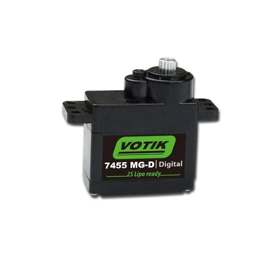 Servo Digitale VOTIK 7455 MG-D 9g a Ingranaggi Metallici per Aerei e Elicotteri RC, Aerei Interni in EPP CaratteristicheServo ad alta tecnologia. Il 7455 MG-D è il servo più potente nella categoria da 9g.Tutto in questo servo è stato pensato per offrire le migliori performance.Progettazione elettronica di altissima qualità, potenziometro e motore.Perfetto per parkflyer affidabile, interni ed elicotteri di classe 450.DescrizioneIngranaggi: Metallo alluminioCuscinetto a sfere: SÌ 1Gioco dell'ingranaggio: molto bassoPeso: 12.93gDimensioni: 23,6 x 26,9 x 11,5 mm Velocità/Coppia@ 4,8V: 0,15 sec/60° 3,3kg/cm Velocità/Coppia@ 6V: 0,13 sec/60° 4,2kg/cm Tensione di esercizio: 4,8V - 6V Corrente inattiva: 4 mA a 4,8V, 5 mA a 6,0VCorrente di funzionamento (senza carico): 250mA a 4,8V, 300mA a 6,0VCorrente di stallo: 1,1A a 4,8V, 1,3A a 6,0VLunghezza della cinghia: 260 mm Compatibilità: UniversaleBanda morta: 3 μsPrecisione elettrica: 2 μsPacchetto incluso1 x VOTIK 9G Servo Digitale 7455 MG-D Ingranaggi in Metallo per Drone RC Elicottero Aereo EPP
