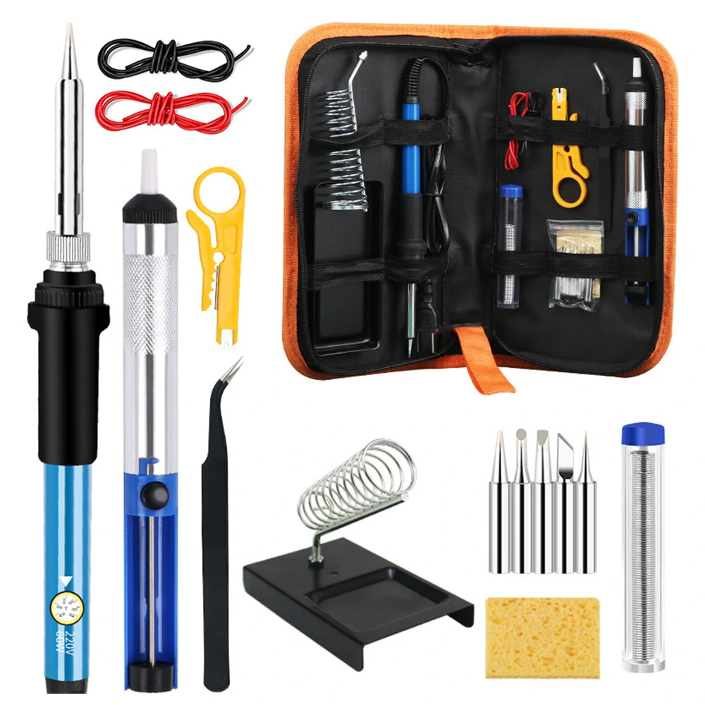 Description 1 Soldering Iron Support Station Standard dual spring soldering iron holder with sponge is a very useful tool when the soldering iron work It has a secure base and it is more safer than any other thin soldering stand The maximum extent to avoid the user was burned and damaged 2 Soldering Iron Unique Features Superior professional soldering iron has 5 multiple tips replacement Heat and impact resistant design of screw thread so the iron head is not easy to drop Adjustable Temperature from 200℃ 450℃ Heat up fast and work great 3 Solder Sucker Desoldering Pump Rugged metal construction the desoldering pump is high pressure vacuum tube with aluminum body frame which allows easy one handed use best for removing solder from PCB through hole solder joints 4 Widely UsedCarry Portable Soldering iron tools widely used for welding circuit board appliance repair Home DIY hobbyists jewelry welding You can take it anywhere and you will be able to find the tools you need in the carry bag Specification Work Voltage 220V Power 60W Temp Rang 200℃ 450 ℃Tweezer ESD 15 ength 4 7inchesSoldering Iron Stand SteelTips Model 900M seriesDesoldering Pump Plastic and aluminum alloyCarry Bag PU leatherPackage Included 1 x Adjustable Temperature Welding Iron 1 x Desoldering Pump solder sucker 5 x Different Soldering Iron Tips 900M series1 x Tin Wire Tube1 x Soldering Iron Stand1 x Tweezers 1 x Wire Stripper Cutter2 x Electronic Wire1 x Paddle1 X PU Tool Carry
