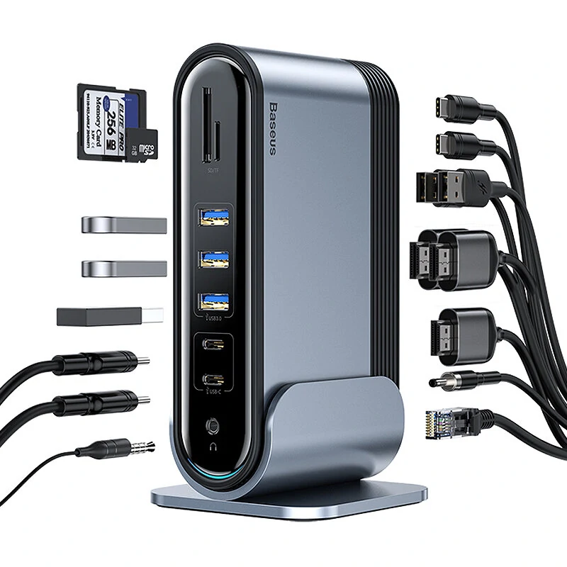Özellikler:MarkaBaseusÜrün Tipi17-in-1 USB 3.0 Hub Docking StationRenkGümüşMalzemeAlüminyum alaşımlıGiriş ArayüzüTip-CÇıkış ArabirimiUSB2.0*2 / USB3.0*3 / USB-C*2 / HDMI*3 / RJ45 / USB-C PD*2 / SD/TF / 3.5mm SesAktarma Hızı5GbpsBoyut (U*G*Y)165*80*80mmÖzellikler: 1. Çok Yönlü Giriş ve Çıkışlar: Baseus veri aktarım istasyonu, USB 2.0, USB 3.0, USB-C, HDMI, RJ45, USB-C PD, SD/TF Kart yuvaları ve 3.5mm Ses jakı dahil olmak üzere çeşitli bağlantı noktaları sunar.Yüksek Hızda iletişim: 5Gbps'e kadar bir iletişim hızı ile hızlı veri aktarımı ve sorunsuz HD görüntü çıkışı yaşayın.3. Dayanıklı yapı: Yüksek kaliteli alüminyum alaşımından yapılmış olup, dayanıklılığı sağlarken aynı zamanda şık ve cilalanmış bir estetik katar.4. Kompakt ve Hafif: 165*80*80mm kompakt boyutları,docking istasyonunu taşınabilir ve iş,seyahat veya ev kullanımı için her yerde kolayca taşınabilir hale getirir.5. Verimli Güç Dağıtımı: PD protokolü ile donatılmış USB-C PD portları, çeşitli cihazlar için hızlı ve güvenli şarj imkanı sağlar.Paket İçeriği:1 x Baseus 17'si 1 tip C Docking Station1 x Kablo1 x İngiltere Adaptörü1 x AB Adaptörü1 x DC Kablosu CN
