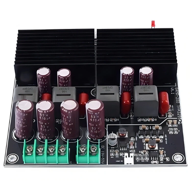 Spécifications:Chipset : Double TPA3255Mode de fonctionnement : Classe DTension de fonctionnement : DC 19-50V, Courant ≥ 5ADimensions : 140 x 125 x 30 mmPoids : 342 gPuissance de sortie:600W/2Ω x2315W/4Ω x2200W/8Ω x2Distorsion harmonique totale (DHT) : 0,006%Réponse en fréquence : de 20 Hz à 30 kHzMéthodes d'entrée : écouteur 3,5 mm,XH2.54,RCA Fonctionnalités:1. Haute puissance de sortie : Cette carte amplificateur délivre une puissance impressionnante de 600W par canal sur des charges de 2 ohms,la rendant adaptée à l'alimentation de haut-parleurs puissants et à la production d'un son clair et fort. Elle prend également en charge 315W par canal sur des charges de 4 ohms et 200W par canal sur des charges de 8 ohms,offrant des options flexibles pour diverses configurations audio.2. Fonctionnement efficace de la classe D : En utilisant une technologie avancée de classe D,cet amplificateur atteint une haute efficacité et une faible consommation d'énergie tout en offrant une qualité sonore supérieure. L'efficacité du fonctionnement de classe D réduit la génération de chaleur,permettant un design compact sans nécessiter de radiateurs encombrants.3. Chipset TPA3255 double : Équipé de deux puces TPA3255, le circuit amplificateur garantit des performances audio stables et de haute qualité. Le chipset TPA3255 est connu pour sa haute puissance de sortie,sa faible distorsion et sa large réponse en fréquence,ce qui le rend idéal pour les applications audio haute fidélité.4. Large plage de