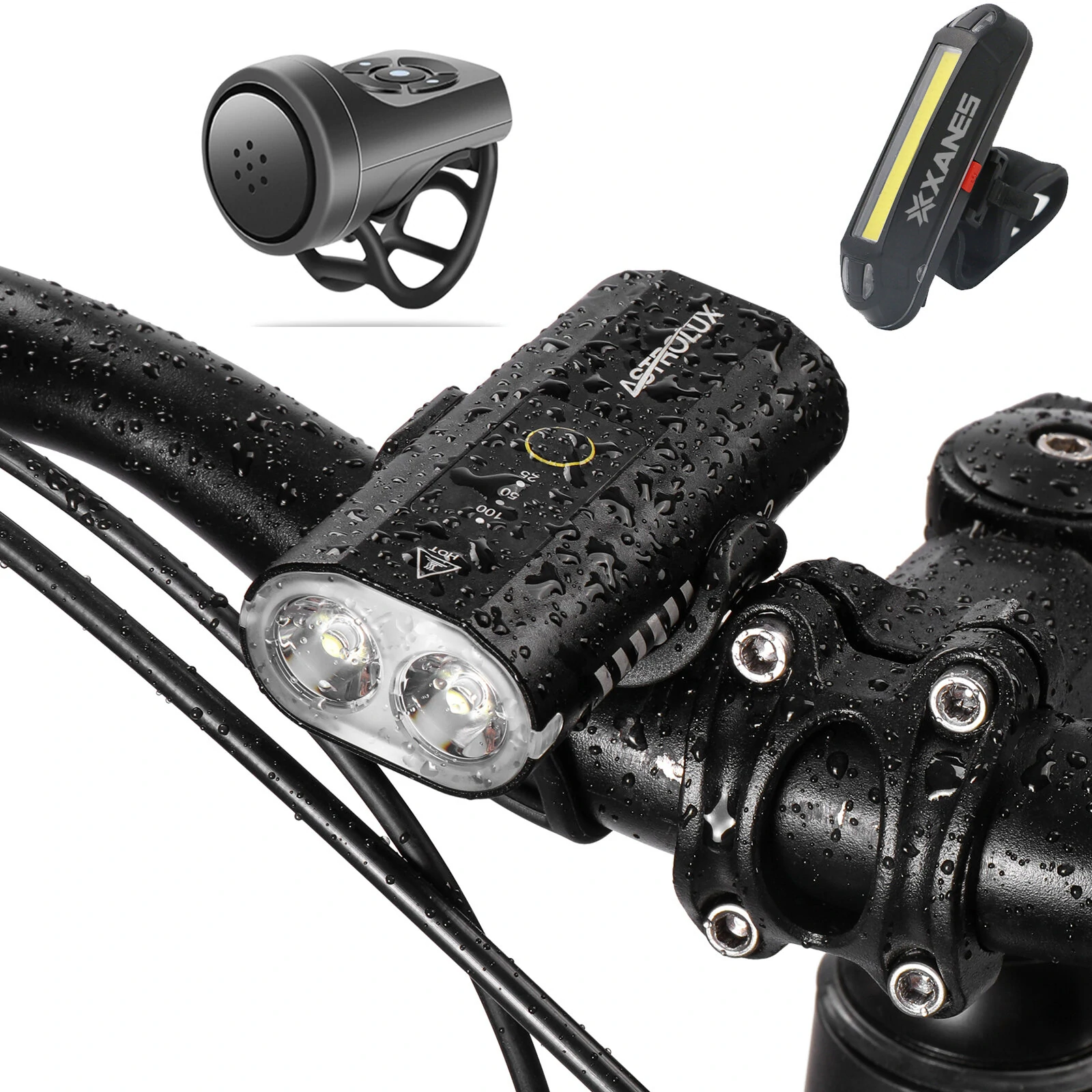 헤드라이트 사양:LEDXPG*2출력800LM모드낮음-중간-높음-스트로브-SOS배터리2600mah충전 유형타입-C충전 시간3h방수 등급IP64 (방수)치수79*41*24mm순중량95.2g색상 상자 액세서리131g색깔검은색인증CE/ROHS/PSE/MSDS부품 목록라이트 + 고정 링 + 브라켓 + 충전 케이블색상 상자 크기106*50*45mm특징:1. USB 직접 충전, 충전 및 방전 디스플레이, 남은 전력 디스플레이2. 측면 경고등을 가지고3. 항공 알루미늄, 초장량 지속시간4. 고효율 이중 램프 비드, 고강도 방수 거리 조명 5. 방수 디자인, 두꺼운 방수 링, 회로 절연 보호6. 4단계 밝기 조정, 약한 빛 - 중간 빛 - 강한 빛 - 폭발적인 플래시테일라이트 사양:브랜드XANES 재료ABS류멘500 루멘 하이라이트 (일반 밝기)크기80*20*15mm순중량35.5g방수네LEDCOB 고밝기 LED 패널배터리3.7V 500mAh 리튬 폴리머 배터리(내장), USB 충전 가능밝은 색빨강 + 흰색5 모드s빨간불 (일반 밝기)화이트 라이트 (일반 밝은)빨간 불 깜박임빨간 불이 천천히 깜빡입니다빨간색과 흰색 빛이 번갈아 가며 깜박입니다실리카 젤 버클 고정Φ12-34mm 핸들바 / 시트포스트 / 포크 / 체인 스테이 등에 설치할 수 있습니다특징: 원하는 모드로 전환하려면 하나의 키로 제어할 수 있습니다. 모든 당신의 요구를 충족시키기 위해 자전거 전면 라이트 또는 후미등으로 사용할 수 있습니다.혼 사양:매개 변수값브랜드Xmund제품명전동 자전거 호른재료ABS혼 데시벨120-140dB배터리 용량200mAh음성 모드4크기60 * 38mm무게33g 특징:- 일반 자전거 / 로드 바이크 / 산악 자전거 / 전동 스쿠터 / 어린이 스케이트 보드에 적합합니다.- 벨: 알람 모드를 켜려면 버튼을 클릭하십시오. 버튼을 3초 동안 누르면 경적이 2번 울립니다. 알람 모드를 끄려면 버튼을 3초 동안 누르고 경적이 1번 울립니다.- 충격을 감지하여 방범 알람을 활성화하는 움직임 감지 기능이 민감합니다. 6초 동안 정지 상태로 있을 때 도난 방지 상태로 진입하고 진동을 감지하면 경적이 15초 동안 경보음을 울립니다.- 작은 볼륨, 큰 볼륨, 140dB의 고분위기 경보음으로 시끄러운 도로에서도 원활하게 길을 열 수 있습니다.- 밀폐 및 방진, 방수 등급, 고강도 충격에 견딜 수 있어 비 오는 여행에 겁 없이 사용할 수 있습니다. 패키지 목록:1 x 헤드라이트1 x 브레이크 라이트1 x 잡아두는 링1 x 브라켓1 x 충전 선1 x USB 케이블1 x 자전거 경적1 x USB 데이터 케이블1 x 방지 슬립 패드2 x 실리콘 스트랩