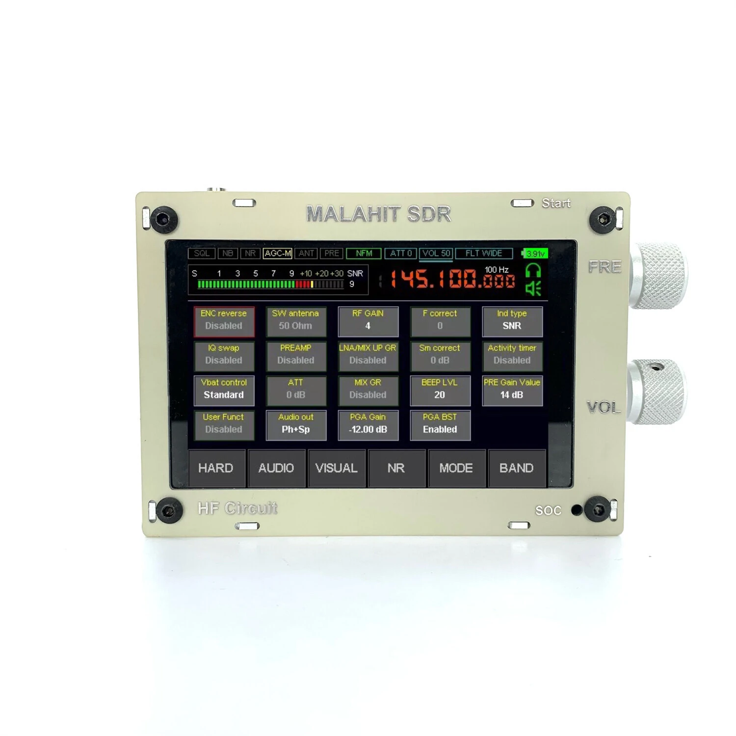 Points saillants:1. Écran capacitif de 3,5 poucesStructure de carte à 4 couches, performance supérieure à celle d'un PCB à deux couches.3. Adoptez une unité sonore, 2 chambres vibrantes, le haut-parleur est livré avec une chambre sonore, la qualité du son des basses est très complète4. Coque en alliage d'aluminium5. Le haut-parleur possède une membrane de basse intégrée, les basses sont épaisses et les aigus sont clairs Fonctionnalités:- Structure de carte à 4 couches, performances supérieures- Écran capacitif IPS de 3,5 pouces- Batterie au lithium rechargeable intégrée de 3000 mA- En utilisant des haut-parleurs à cavité de son de diaphragme de basse, meilleure qualité sonoreFlash via câble USBBouton de commande numérique intégré en alliage d'aluminium, encodeur EC11Plage de fréquence prise en charge de 50KHz à 2GHz (250MHz-400MHz est bloqué par l'auteur)- Avec code d'inscriptionMode de démodulation USB, AM, SSB, NFM, WFM, CW, DSB- Version du firmware 1.10c- Si vous commandez la version avec la carte d'extension intégrée, nous l'installerons pour vous avant de l'expédier. La carte d'extension est facultative. Spécifications:La radio est construite selon le principe de SDR : la fonction est déterminée par le logiciel chargé;2. Plage de fréquences prise en charge 50 kHz - 2 GHz (250 MHz - 400 MHz est bloqué par l'auteur)3. Tous les types de modulation analogique AM, SSB, NFM, WFM;4. Fonctions puissantes de filtre de largeur variable, supresseur de bruit adaptatif, supresseur de