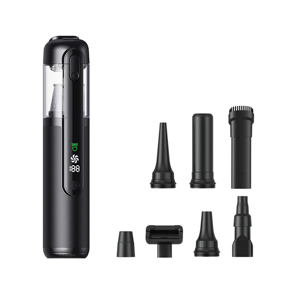 Especificaciones:Nombre del producto: Aspiradora de coche con luz verde Material: Aleación de zinc + ABS + PC Potencia de succión: 16000PA Duración de la batería: 27 minutos Capacidad de la batería: 2000mah Tiempo de carga: 2.5-3.5 horas Puerto de carga: Tipo-C Capacidad del recipiente de polvo: 150ml Peso del paquete: 508g Tamaño: 329*57mmCaracterísticas:1. Succión potente de 16,000PAElimina el polvo,las migas y los desechos de cada rincón de su automóvil de manera rápida y eficiente.2. Indicador de polvo de luz verdeLa luz verde integrada resalta el polvo y la suciedad ocultos,asegurando que no se omita ningún lugar.3. Ajuste de doble velocidadLa segunda velocidad le permite alternar entre una succión fuerte y suave para diferentes necesidades de limpieza.4. Pantalla digital inteligenteMuestra el nivel de batería y el modo actual de un vistazo para una operación fácil y sin preocupaciones.5. Eliminación de polvo con un solo clicVacíe rápidamente el contenedor de polvo con solo presionar un botón para una limpieza sin complicaciones.6. Función de soplado y succiónLos modos de aspiración y soplado integrados facilitan la limpieza de espacios reducidos,rejillas de ventilación y alfombrillas de automóvil.Incluye:1 x Aspiradora Limpia1 x Cable de carga1 juego de boquilla de succión
