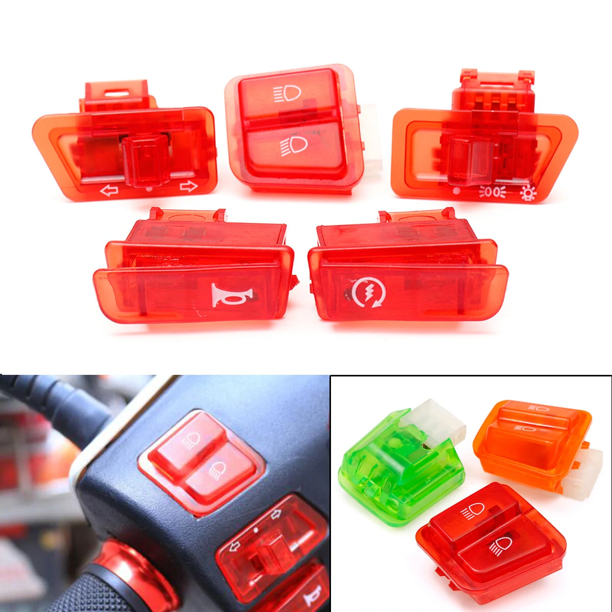 설명:새로운 좋은 품질, 사용하기에 견고합니다.엄격한 품질 관리 기준에 따라 제작되었습니다.공장을 떠나기 전에 테스트되었습니다.쉬운 설치와 사용이 쉽습니다. 완벽한 애프터마켓 교체품. 사양:유형: 오토바이 스위치 재료: 플라스틱과 구리색상: 오렌지/녹색/빨강적합 : GY6 50cc 125cc 150cc 오토바이 스쿠터용포함된 패키지:1 x 2 핀 혼 스위치1 X 2 핀 스타터 스위치1 X 3핀 방향 지시등 스위치1 X 3 핀 헤드 라이트 디머 스위치1 X 6 핀 헤드 라이트 스위치