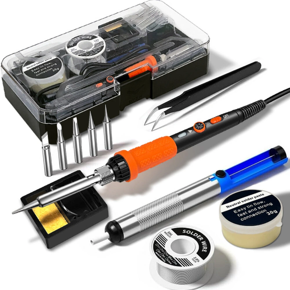 Especificações:- Tensão de entrada: 110V, 60Hz- Potência: 60W- Faixa de temperatura: 200°C - 450°C (392°F - 842°F)- Comprimento do cabo: 3,94 pés- Elemento de aquecimento: aquecedor de cerâmica- Controle de temperatura: Ajuste de botão Recursos:1. Aquecimento eficiente: Com a avançada tecnologia de aquecimento cerâmico,o ferro de solda aquece rapidamente,garantindo uma soldagem mais suave e uma maior eficiência.2. Controle de temperatura ajustável: O controle de temperatura sem várias etapas permite fácil ajuste entre 200 °C e 450 °C, adequado para várias tarefas de soldagem.3. Segurança aprimorada e economia de energia: O ferro de solda possui um interruptor lig/ deslg para economia de energia e segurança,juntamente com seis ventiladores para prevenir o superaquecimento.4. Pontas de soldagem versáteis: Inclui cinco formas diferentes de pontas de soldagem para atender às necessidades de soldagem de precisão, soldagem em grandes áreas e reparos em vários itens.5. Design ergonômico da alça: O ferro de solda é equipado com uma capa protetora de silicone resistente a altas temperaturas e uma alça ergonômica antiderrapante para um uso confortável e seguro. Pacote incluído:1 x Ferro de Solda (60W)1 x Fio de solda1 x pasta de solda1 x Bomba de dessoldagem5 x Pontas para solda1 x Estojo de ferramentas portátil1 x Pinças1 x Esponja