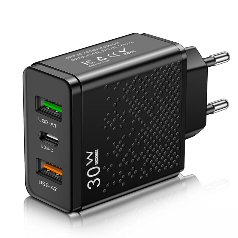 사양:색깔블랙/화이트재료PC+ABS크기US-28*55*78mm, EU-28*55*100mm무게US-48g,EU-50g인터페이스2USB-A+USB-C입력AC100-240V 50-60Hz, 0.5A출력5V/2.4A프로토콜PD QC3.0유형유럽 플러그/미국 플러그력30W특징: 1. 높은 호환성: 이 충전기는 2개의 USB-A 포트와 1개의 USB-C 포트를 통해 여러 장치 연결을 지원하여 다양한 장치에 적합합니다.2. 빠른 충전: 최대 5V/2.4A 출력을 통해 스마트폰, 태블릿 및 기타 호환 장치에 대한 빠른 충전을 제공합니다.3. 전원 공급 및 퀵 차지 3.0: PD 및 QC3.0 프로토콜을 지원하여 이러한 기술을 지원하는 장치에 대한 효율적이고 최적화된 충전을 가능하게 합니다.4. 컴팩트한 디자인: 충전기는 크기가 작고 가벼워서 여행 중에 휴대하기 쉽습니다.5. 안전하고 신뢰할 수 있습니다: 내장된 안전 기능이 과충전, 과열 및 단락으로부터 보호하여 충전 중 귀하의 장치의 안전을 보장합니다.패키지에 포함된 것:1x 벽 충전기