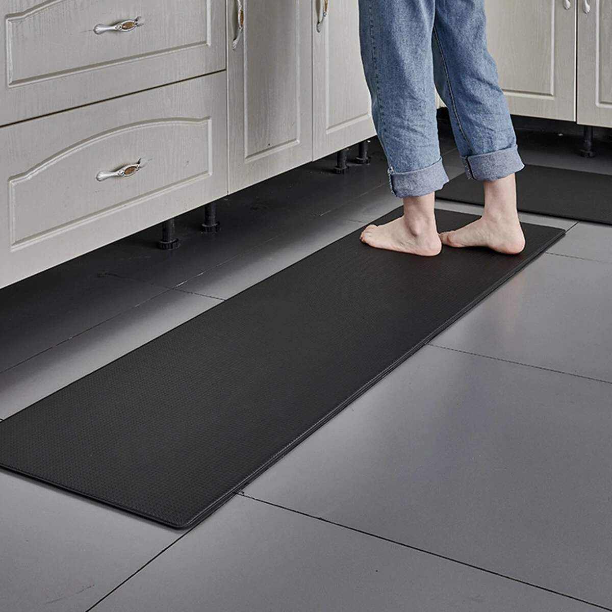 Mutfak Zemin Uzun Kilim Mat - Suya Dayanıklı, Yağa Dayanıklı, Kaymaz, Yorgunluğa Karşı - Deri Dokulu - Siyah, Gri☞ Özellikler✔ Rahat ayak hissi: 8mm kalınlığındaki zemin matı yavaşça esneklik kazanır ve rahat bir ayak hissi sağlar. Uzun süre ayakta durmak sizi yorgun hissettirmez.✔ Kolay temizlenir: Su geçirmez malzemeden yapılmıştır, su lekeleri ve yağ lekeleri kolayca silinebilir, sizi zahmetli temizlik işlerinden kurtarır.✔ Güvenli ve stabil: Çift taraflı kaymaz tasarımı aşınmaya dayanıklı ve çizilmeye karşı dayanıklıdır, düşmesi kolay değildir, adımlarınız daha stabil olur.✔ Mutfak gereçlerinin düşmesini önler: Mat, mutfak gereçlerinizi kazara düşmelere karşı etkili bir şekilde koruyabilir, daha fazla huzur sağlar.✔ Çevre dostu ve güvenli: Çevre dostu malzemelerden yapılmış, zararlı maddeler içermeyen uzun ömürlüdür, sağlığınızı garanti altına alır ve çevreyi korur.☞ Açıklama✔ Malzeme: PVC✔ Ölçüler: 45x75cm 1 adet, 45x120cm 1 adet✔ Paketleme: Kilim x 1 adet