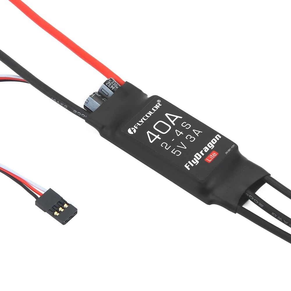 Especificação:Marca: FLYCOLORModelo: FlyDragon Lite Plus 40A 2-4S ESCCorrente contínua (boa dissipação de calor): 40ACorrente instantânea (boa dissipação de calor): 50ABEC: 5.5V / 3ABateria de lítio: 2-4SPeso: 51gDimensões: 65x26x15.5mmFuncionalidade:- Poderoso MCU EFM8BB21;- BEC embutido;- Dois métodos de ajuste de parâmetros: cartão de programação e controle remoto;- Múltiplas funções de proteção.Nota:1. O tamanho e o peso são apenas para referência. Pode haver erros de medição. Consulte o objeto real para mais detalhes.2. Ajuste de parâmetros do cartão programável, mas o cartão de programação não está incluído e precisa ser comprado separadamente. Você também pode optar por usar o controle remoto para ajustar os parâmetros.3. Este ESC é um ESC sem escovas unidirecional, que pode ser configurado para bidirecional usando um cartão de programação.Pacote incluído:1 x FlyDragon Lite Plus 40A 2-4S ESC sem escovas