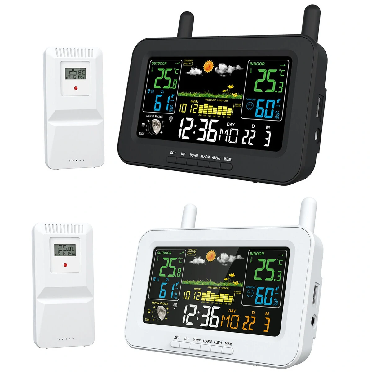 mso-bidi-font-family: 'Times New Roman'; font-size: 10.5000pt; mso-font-kerning: 1.0000pt;Caratteristiche:mso-bidi-font-family: 'Times New Roman'; font-size: 10.5000pt; mso-font-kerning: 1.0000pt;mso-bidi-font-family: 'Times New Roman'; font-size: 10.5000pt; mso-font-kerning: 1.0000pt;【】Monitoraggio preciso del meteo】Questa stazione meteorologica è dotata di un sensore 3CH RF a 433 MHz in grado di rilevare con precisione la temperatura e l'umidità entro un raggio di 60 m. Resta informato sulle condizioni meteorologiche circostanti con facilità.mso-bidi-font-family: 'Times New Roman'; font-size: 10.5000pt; mso-font-kerning: 1.0000pt;mso-bidi-font-family: 'Times New Roman'; font-size: 10.5000pt; mso-font-kerning: 1.0000pt;【】Display chiaro e informativo】Lo schermo a colori wireless di questa stazione meteorologica da esterno fornisce una visualizzazione chiara e vibrante di varie informazioni tra cui l'ora 12-24, la temperatura da -9,9°C a 50°C, l'umidità dell'aria dal 20% all'95%, la data, la pressione atmosferica da 600 hPa/mb a 1100 hPa/mb, e le 12 fasi lunari. Tutti i dettagli essenziali del tempo sono presentati convenientemente per il vostro riferimento.mso-bidi-font-family: 'Times New Roman'; font-size: 10.5000pt; mso-font-kerning: 1.0000pt;mso-bidi-font-family: 'Times New Roman'; font-size: 10.5000pt; mso-font-kerning: 1.0000pt;【】Versatilità funzionale】Questa Stazione Meteo Wireless non solo funge da affidabile monitor di temperatura e umidità, ma funziona anche come sve