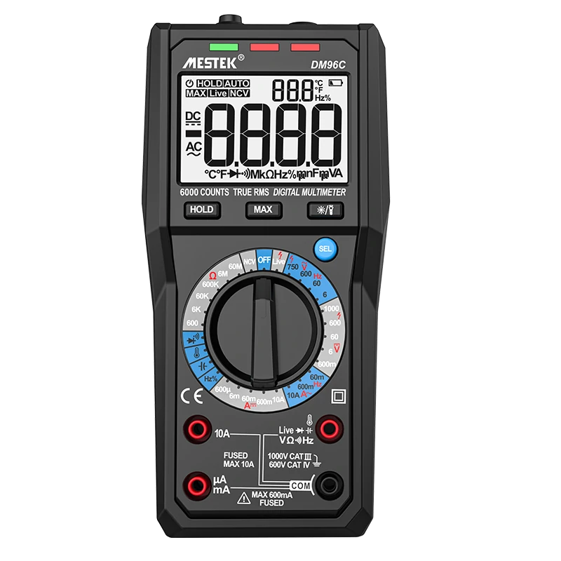 Caratteristiche:Ampia gamma di misurazioni: Il multimetro digitale auto TRMS di grandi dimensioni misura con precisione tensione CA/CC fino a 1000V e corrente CA/CC fino a 10A.True RMS e 6000 Count: Assicura letture accurate e consente misurazioni precise con un display ad alta risoluzione.Test di NCV a doppio intervallo: Identifica rapidamente i cavi neutri e attivi utilizzando l'intensità della luce, migliora la sicurezza durante il lavoro elettrico.Allarme sonoro/visivo: fornisce avvisi chiari per varie condizioni, garantendo la consapevolezza dell'utente durante le misurazioni.Indicatore di carica del condensatore: Funzione comoda per verificare lo stato dei condensatori.Design ergonomico: Il multimetro è progettato tenendo conto del comfort dell'utente, permettendo un uso prolungato senza affaticamento.Stampaggio a doppia iniezione: Offre resistenza e una presa sicura per una maggiore protezione in ambienti impegnativi.Resistente agli urti: resiste a cadute accidentali fino a 1 metro, garantendo longevità e affidabilità.Torcia e retroilluminazione automatica: Torcia integrata e funzione di retroilluminazione automatica per una maggiore visibilità in condizioni di scarsa illuminazione. Specifiche:Nome del marchio: MESTEKModello opzionale: DM96/DM96C/DM96AMisurazione dell'intervallo di induttanza: multimetroSchermo: schermo LCDVisualizza contatori: 6000Protezione da sovraccarico a gamma completa: 250VCapacità: 0-60mFFrequenza: 50-1000HzSpegnimento automatico: circa 15 minu
