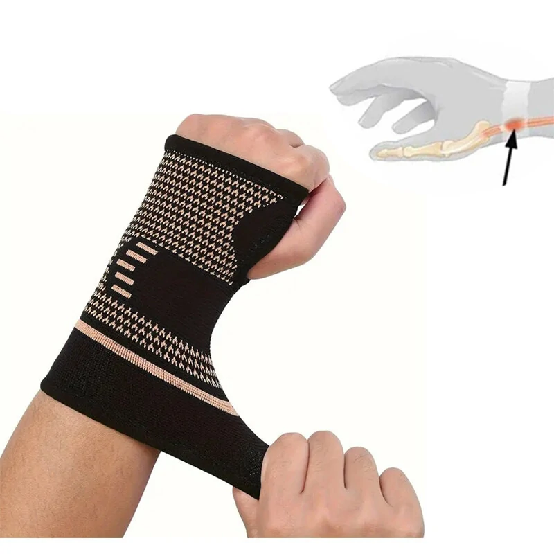 Specifications MaterialCopper Nylon 65 Spandex 15 Nylon 20 ConditionBrand NewHigh QualityBody PartHand WristGenderUnisexColorBlackSizeS 17 8 5cmM 17 9 5cmL 17 10 5cmQuantity1 pcs Features 1 Copper fiber knitting The handguard is made of high quality copper fiber knitting which provides excellent support and protection for sports activities 2 Effective wrist protection The wrist brace is designed to effectively protect the wrist from sprains and injuries during sports activities such as volleyball fitness and basketball 3 Comfortable to wear The handguard is made of soft and breathable material ensuring maximum comfort during sports activities 4 Copper ion technology The handguard contains copper ions which have antibacterial properties keeping the hands clean and hygienic during sports activities 5 Adjustable design The wrist brace is adjustable allowing for a customizable fit for different individuals Package includes 1 pcs Sports Wrist StrapNote Due to the different monitor and light effects the actual color of the item might be slightly different from the color shown on the pictures Thank you Please allow a 1 2cm measuring deviation due to manual measurement