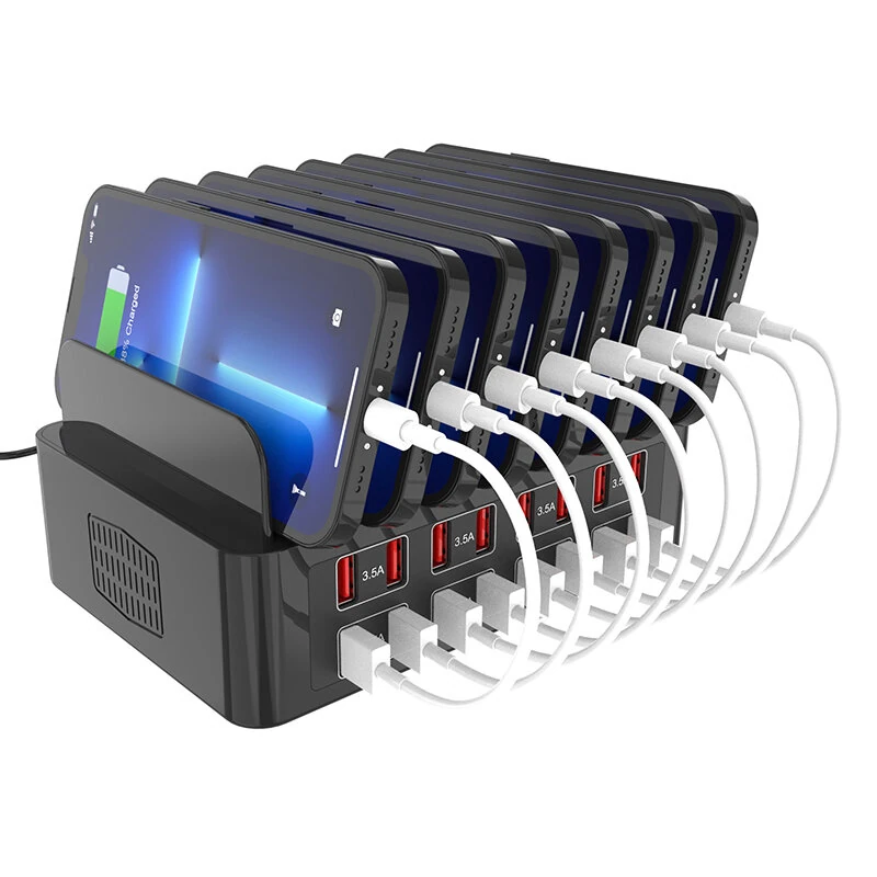 Specification Model YFY A55Product Name 16 Port USB Charging StationInput Frequency 50 60HzTotal Power 30A 150W Product Weight 780gInput Voltage 110V 240V ACSingle Port Output 5V 2 4AProduct Dimensions 17 6 x 12 x 8 cmCharger EU typeFeatures 1 High Speed Charging Offers rapid charging for up to 16 devices simultaneously ensuring efficiency and saving time 2 Universal Compatibility Suitable for a wide range of devices including for iPhone 16 Pro 15 14 13 Pro Max Huawei Mate XT and Xiaomi MIX Fold4 3 Safety Assurance Built in protection against overcharging overheating and short circuiting ensuring the safety of your devices 4 Convenient Design Comes with 8 bracket slots to neatly organize and hold your devices while charging providing a tidy workspace 5 Versatile Input Voltage Supports an input voltage range of 110V 240V AC making it ideal for use in different regions and countries Package Includes 1 x 16 Port USB Charging Station