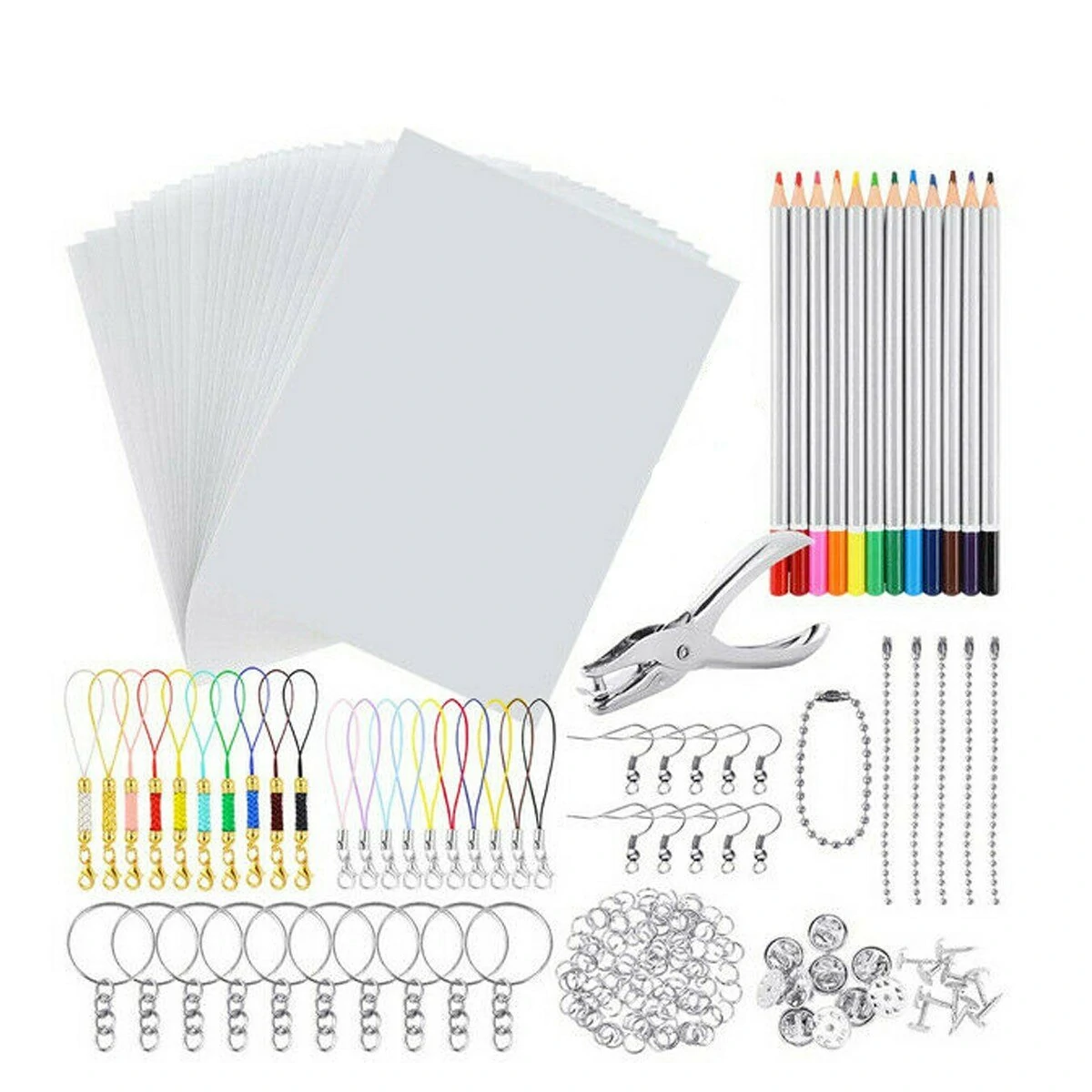 Kit di fogli in plastica termorestringente, carta per arte termorestringente, punzonatrice per fori, portachiavi, matite, fai da teDescrizione del prodotto:Stile: Set di avviamento 33 pezzi / 20145-2 # Set di 145 pezzi / 20145-6 # Set di 198 pezzi (opzionale)Tipo C: 198 pezzi/setSet di plastica termorestringente: 20 x fogli di pellicola termorestringente bianca, 12 x matite colorate, 165 x accessori portachiavi, 1 x punzonatriceTipo B: 145PCS/SETIl pacchetto include: 20 x fogli di film termoretraibile, 125 * accessori in metallo. Crea arte termoretraibile con facilità e mostra la tua creatività con qualcosa di così squisito e facile da usare.Tipo A: 33 pezzi/setSet di plastica termoretraibile: 10 fogli di pellicola termoretraibile vuoti, 12 matite colorate, 10 portachiavi, 1 perforatriceCaratteristiche:Semplice da usare: basta disegnare e colorare la tua arte preferita, ritagliarla con le forbici e si ridurrà di dimensioni nel tuo forno.-Ampie applicazioni: Innumerevoli utilizzi creativi di portachiavi, gioielli, bottoni, etichette regalo, tirazip, segnalibri, scrapbooking e ornamentiLa confezione include:1 * Kit di fogli in plastica termoretraibileUlteriori dettagli: