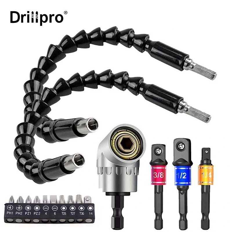 Description:Ensemble de 16 extensions de foret flexibles Drillpro avec embout hexagonal, adaptateur de douille universelle, rallonge de foret pliable, embout de tournevis et rallonge de forage à angle droitSpécification:Couleur: Argent et noirMatériau : Acier inoxydableTaille de l'adaptateur de prise:1/4 * 1/4 * longueur de 65 mm - la tige de 1/4 " peut être convertie en tête carrée de 6,35 mm3/8 * 1/4 * longueur 65 mm - la tige de 1/4 "peut être convertie en tête carrée de 9 mm1/2 * 1/4 * longueur de 72 mm -- 1/4 " tige peut être convertie en tête carrée de 13 mmQuantité: 16 pièces/ensembleFonctionnalité:1. Perceuse d'Angle de 105° : Conception à 105° pour les espaces restreints, augmente la puissance d'un tournevis sans fil, couple maximal : 10n/m.2. Adaptateur de prise universel : L'arbre d'entraînement hexagonal de 1/4 de pouce est compatible avec un changement rapide et s'adapte à la plupart des mandrins de perceuses et de tournevis.3. Extension de foret flexible: extension de foret flexible de 11,7 pouces, facile, légère, rapide, se connecte à la visseuse hexagonale standard.4. Ce kit d'extension fonctionne très bien lorsque vous avez un accès limité.Forfait inclus:3 x Adaptateur de prise1 x Perceuse d'Angle Droit de 105°2 x Rallonge flexible pour foretEnsemble de 10 embouts de tournevisPlus de détails: