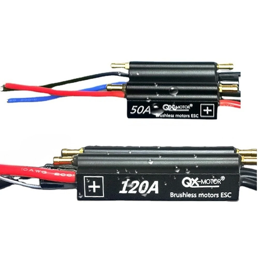 Descrizione:Marca dell'articolo: motore QXNome articolo: ESC senza spazzoleMateriale: MetalloColore: NeroDimensione del prodotto: 50A esc è di circa 86*38*22mm, 120A esc è di circa 113*45*22mmPeso del prodotto: 50A è di 107 g, 120a è di 170 gModelli compatibili: modelli subacquei, modelli di barche radiocomandate sottomarineSpecificazione:Regolatore elettrico senza spazzole marino QX motor 50A Corrente di uscita continua: 50A 2. Tipo BEC: Modalità lineare 3. Uscita BEC: 5,5 V / 5 A 4. Ingresso: 2-6s Lipo Peso: 107g 6. Diametro interno/esterno dell'ugello di raffreddamento dell'acqua: Ф 3.0 / Ф 5.0 7. Dimensione (compresa la lunghezza che si estende dalla bocchetta di raffreddamento con acqua): 86x38x22mm 8. Applicazione: Adatto per scafi con lunghezzaQX motore 120a regolatore elettrico marino brushlessr 1. Corrente di uscita continua: 120A 2. Tipo BEC: Modalità lineare 3. Uscita BEC: 5,5 V / 5 A 4. Ingresso: 2-6s Lipo Peso: 170g 6. Diametro interno/esterno dell'ugello di raffreddamento dell'acqua: Ф 3.0 / Ф 5.0 7.Dimensioni (compresa la lunghezza che si estende dalla bocchetta di raffreddamento dell'acqua): 113x45x22mm 8.Applicazione: Adatto per scafo con lunghezza Il regolatore elettrico ha un rapporto qualità-prezzo elevato, adotta un elevate prestazionie un MCU a 8 bit ATmega168 a basso consumo energetico, e la frequenza massima di lavoroè 20 MHz; Adatto per guidare tutti i tipi di motori trifase senza spazzole presenti sul mercato, specialmente per modelli di navi radioco