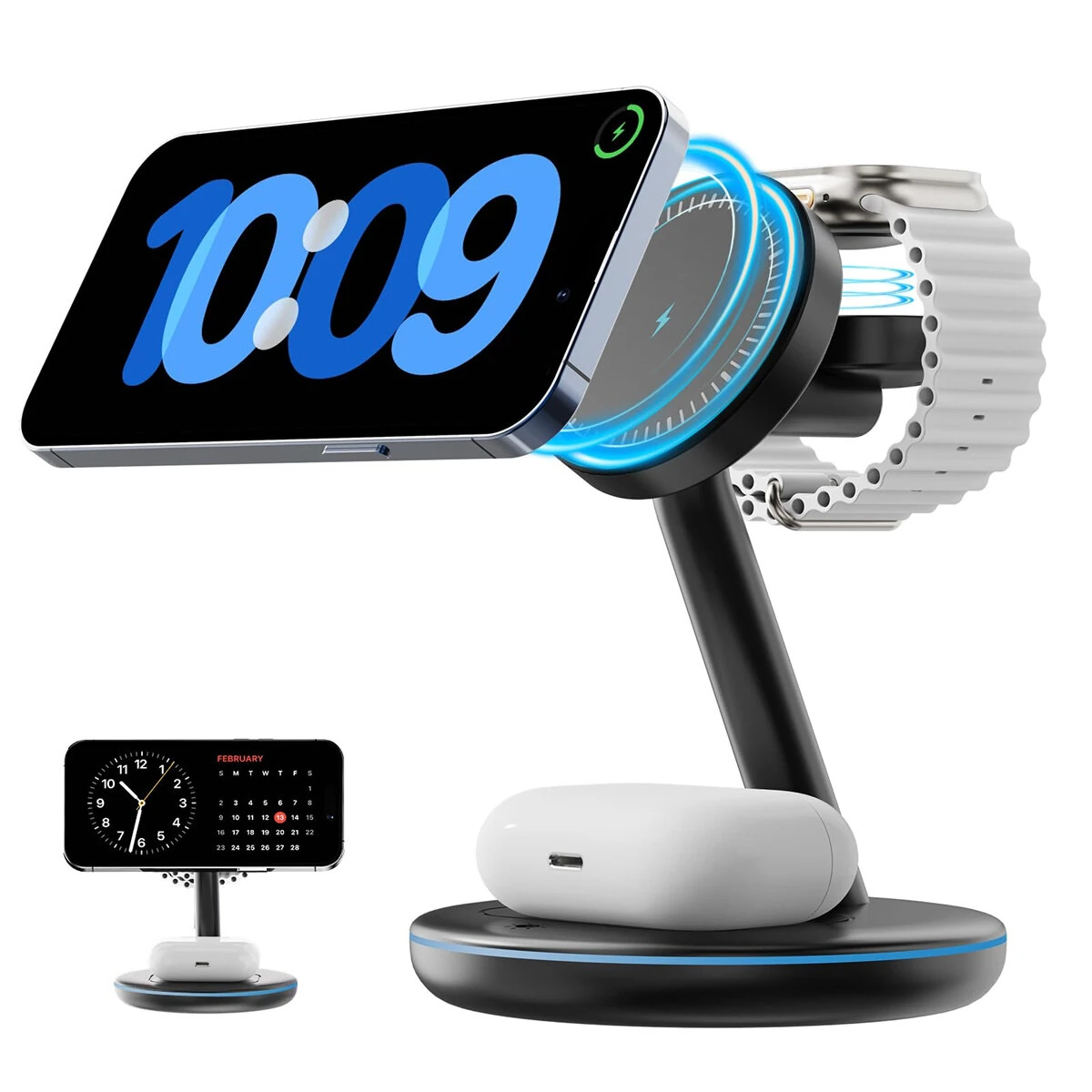 تخصيص:نوع المنتج: شاحن لاسلكي مغناطيسي 3 في 1قوة الشحن: شحن سريع 15 واطالتوافق:لأجهزة أيفون من طراز 12/13/14/15/16 (Mini و Plus و Pro و Pro Max).ساعة آبل الترا/ألترا 2/السلسلة 2-10/SE.نماذج AirPods بما في ذلك سلسلة Pro/2/3/4.ميزات الأمان: حماية من الحرارة الزائدة، وفوق الجهد، وفوق التيار، ونظام تبديد الحرارة المدمج.البناء: ضوء قابل للتعديل مع تحكم باللمس، تصميم شحن متعدد الوظائف، متوافق مع MagSafe مع دعم محاذاة مغناطيسية.الميزات:1. شحن فعال: يوفر شحن لاسلكي سريع بقوة 15 واط، مما يضمن أن تصل الأجهزة إلى شحن كامل في حوالي 2.5 ساعة.2. وضع مرن: التصميم المغناطيسي يدعم وضع الهاتف عموديًا أو أفقيًا، وهو مثالي لتشغيل الفيديو أثناء الشحن.3. نظام أمان متقدم: مزود بتحكم في درجة الحرارة، وحماية من التيار الزائد، وحماية من الفولتية لضمان سلامة الجهاز.4. تصميم مناسب للنوم: ضوء مؤشر قابل للتعديل وناعم مدمج لليالي غير المضطربة.5. تنظيم المكتب: يُحسن إدارة الكابلات، ويقلل الفوضى من أجل مساحة عمل نظيفة واحترافية.يشمل الحزمة:1 × حامل شحن لاسلكي مغناطيسي1 × 18W محولكبل شحن USB-A إلى USB-C بتقنية USB-C1 x دليل المستخدم