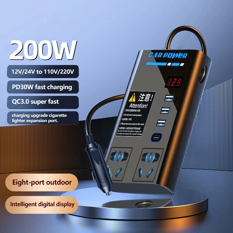 Specifications Product Name Car Inverter ChargerMaterial PC ABSVoltage 12V To 220V 12V To 110VCigar Lighter DC Input 12V 20A Max Output 200V 240V 50Hz 200W Max Corrected Wave USB output 5V 2 4A 9V 2A 10V 2 25A 12V 2 5AType C 5V 2 4A 9V 3A 12V 2 5AUSB Type C 5V 4 8AUSB Type C 24W 30WSize 150 73 35mmWeight About 235gCigar Lighter Cable Length 70CM Car Charger ConnectorFeatures 200W high power This car inverter charger has a rated power of 200W making it capable of powering multiple devices simultaneously It is designed to be safe and reliable ensuring efficient power delivery Upgraded eight output ports full functions This charger supports dual sockets three USB ports QC3 0 PD and a cigar lighter expansion port output With these various output options users can connect and charge different devices such as notebooks tablets mobile phones car refrigerators and car vacuum cleaners Compatible with multiple devices This car inverter charger is versatile and compatible with a wide range of devices Users can conveniently power their notebooks tablets mobile phones car refrigerators and car vacuum cleaners without any compatibility issues Smart digital display The car inverter charger features a smart digital display providing users with clear and easy to read information This display allows users to monitor important details such as power output and charging status at a glance Universal for 12V models This car inverter ch