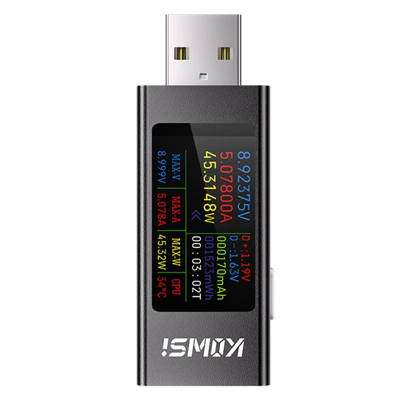 사양:제품 이름: USB-A 테스터 감지기모델: KWS-MX23크기: 58 x 20.8 x 10.7 mm무게: 약 13.7 g전압 측정 범위: 4-30V현재 측정 범위: 0-12A전력 측정 범위: 0-360W용량 범위: 0-666666mAh에너지 범위: 0-999999Wh시간 측정 범위: 0-99시간특징:1. 고정밀 전압 및 전류 모니터링:충전기 성능을 감지하기 위한 전압 및 전류의 정확한 실시간 표시.2. 다기능 디스플레이 모드:하나의 버튼으로 쉽게 전환할 수 있는 여러 디스플레이 페이지와 스타일.3. 데이터 기록 및 통계 정보:최대 전압, 전류, 전력, 용량, 에너지 및 온도를 기록하십시오.포괄적 분석을 위한 시간에 따른 데이터를 표시합니다.4. 호환성:전화 충전기 및 데이터 케이블을 포함한 다양한 장치 및 환경과 호환됩니다.5. 고품질 제작:CNC 금속 외관은 프리미엄한 외관과 감각을 보장합니다.패키지에 포함된 것:1 x KWS-MX23 USB 디지털 디스플레이 테스터