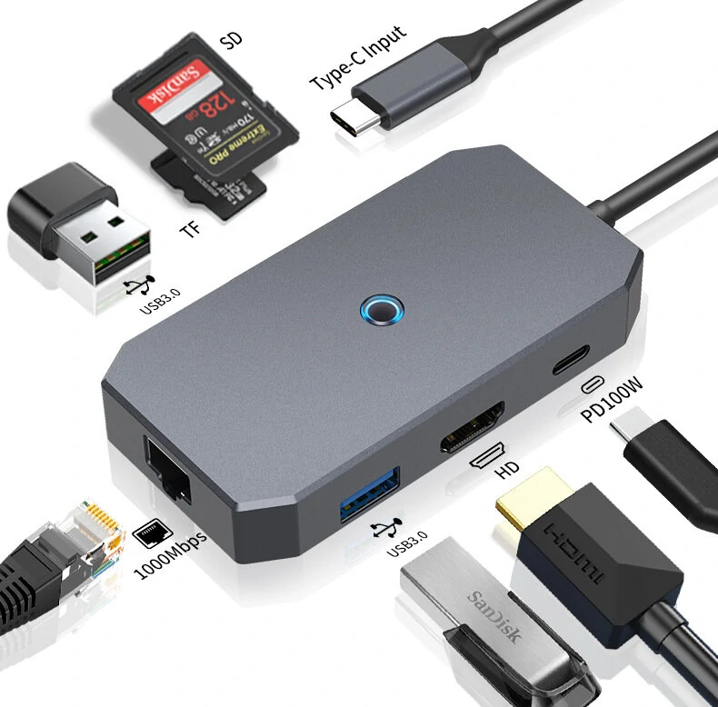 Özellikler:Ürün Tipi7 IN 1 Tip-C Docking StationRenkGriMalzemeAlüminyum alaşımlıGiriş ArayüzüTip-CÇıkış ArabirimiUSB3.0*2(5Gbps)Tip-C*1(PD100W)HD*1(4K@60Hz)RJ45 * 1(1000Mbps)TF Kart YuvasıSD Kart YuvasıAktarma Hızı5GbpsKablo Uzunluğu170mmBoyut (U*G*Y)93*48*15mmAğırlık65gÖzellikler: 1. 7'liFonksiyonlu: Bu docking istasyonu, cihazınızın bağlantı seçeneklerini genişletmek için tasarlanmıştır. İki adet USB 3.0 portu, PD100W şarj desteğiyle bir adet Tip-C portu, bir adet 4K@60Hz HD portu, bir adet Gigabit RJ45 Ethernet portu ve TF/SD kart yuvalarını içerir.2. Hızlı Veri İletimi: USB 3.0 portlarının 5Gbps'ye kadar bir iletim hızıyla, sorunsuz bağlantı için yüksek hızlı veri transferi sağlar.3. Yüksek Çözünürlüklü Ekran: HD bağlantı noktası, desteklediği 4K@60Hz çözünürlüğüyle uyumlu bir monitör veya televizyonda muhteşem görsellerin keyfini çıkarmanızı sağlar.4. Güvenilir Kablolu Ağ Bağlantısı: RJ45 Ethernet bağlantı noktası, 1000Mbps'ye kadar bir hızla istikrarlı ve hızlı bir kablosuz ağ bağlantısı sağlar.5. Kompakt ve Hafif: Yüksek kaliteli alüminyum alaşımdan yapılan bu yükleme istasyonu uzun ömürlü ve hafiftir, seyahat veya günlük kullanım için mükemmeldir.Paket İçeriği:1x 7 İN 1 Tip-C Bağlantı Noktası İstasyonu