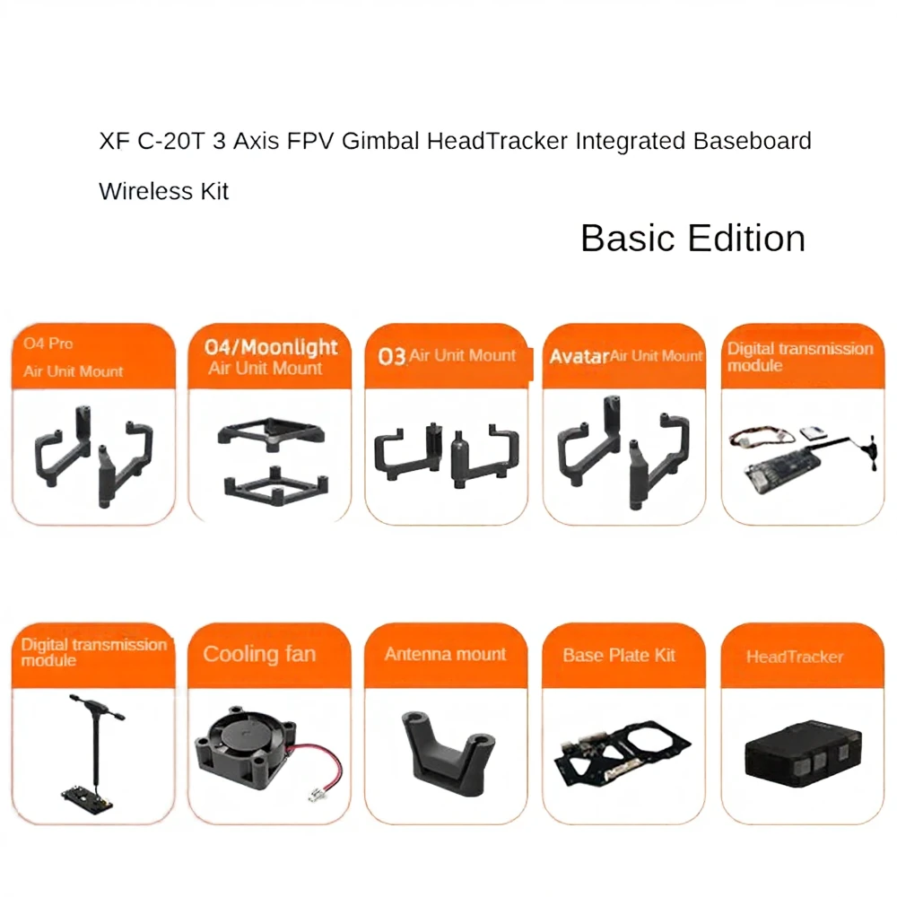 Liberar e atualizarC-20T Registros de lançamento e atualização 2025-7-7A Base Universal Tudo-em-Um tem perfeita compatibilidade com XF C-20T Gimbal FPV de 3 eixos para DJI O4/ O4 Pro eGimbal XF C-20T para unidade DJI O3 versãoFoi projetado para ser versátil e funciona com todos os gimbals da XianFei,permitindo operações integradas.Especificação:Nome do item: Kit sem fio de placa base integrada HeadTracker - Edição básicaTipo de gimbal: 3 eixosUnidades de ar compatíveis: DJI O4 Pro, O4Pacote incluído:1 x Suporte da unidade aérea DJI O4 Pro1 x Suporte para unidade de ar DJI O4 / Moonlight1 x DJI O3 Air Unit Mount1 x Suporte da unidade aérea DJI Avatar1 x Módulo de Transmissão Digital (Lado do Céu)1 x Módulo de transmissão digital (lado terrestre)1 x Ventilador de refrigeração1 x Suporte de antena1 x Kit de placa base1 x HeadTracker