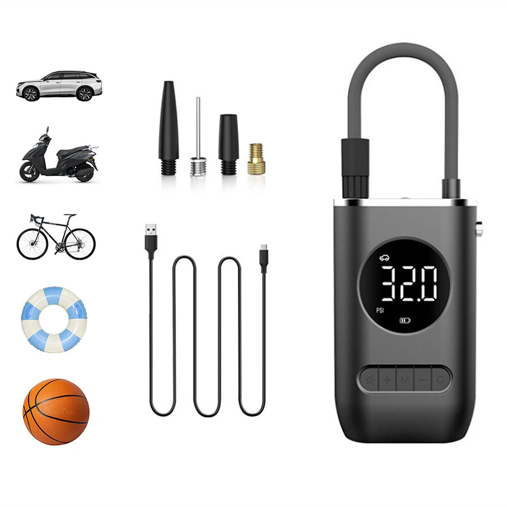 사양: 색깔검은색재료ABS입력 전압5V/2A출력 전력70W인플레이션 범위Max. 150PSI단위PSI, BAR, KPA, KG/CM2배터리내장 4000mAh 리튬 배터리항목 크기137 * 89 * 47mm/ 5.4 * 3.5 * 1.9in물품 무게420g/ 14.8oz패키지 크기150 * 95 * 72mm/ 5.9 * 3.7 * 2.8in패키지 무게520g/ 18.3oz 특징:1. 휴대용 무선 공기 압축기, LED 디지털 디스플레이, 정확한 압력 측정, 타이어 압력 상태의 즉각적인 이해와 여행 안전 보장.2. 네 가지 팽창 모드를 지원하며 다양한 압력 단위(PSI, BAR, KPA, kg/cm2)로 변경할 수 있습니다. 이를 통해 자동차/오토바이/자전거 타이어와 공을 팽창시킬 수 있습니다.3. 미리 설정된 팽창 압력 값, 가득 찬 후 자동으로 펑크되지 않도록 자동으로 멈추므로 시간을 할애하여 타이어 압력 계에 주시할 필요가 없으며, 과도한 팽창으로 인해 타이어가 터질 일도 없습니다.4. 내장형 4000mAh 대용량 배터리로 저전력 소비하며 장시간 사용할 수 있습니다. LED 라이트가 있어 어두운 곳에서 비상 램프로 사용할 수 있습니다.5. 작고 휴대하기 쉬운 경량 디자인으로 어디서든 가방에 넣고 언제든지 타이어 압력을 측정하고 공기를 채울 수 있습니다.포장 목록:1 x Host1 x 공기 튜브1 x USB 케이블3 x 노즐1 x 설명서