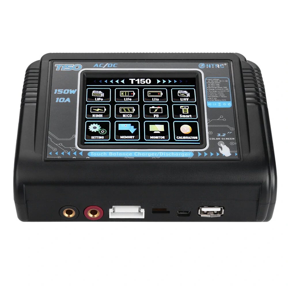 T150은 HTRC에 의해 설계된 새로운 디자인의 다기능 고출력 밸런스 충전기입니다. 3.2인치 컬러 LCD 터치 스크린 디스플레이를 활용하여 사용이 쉽고, 내장 냉각 팬, DC 11-18V 또는 AC 100-240V 이중 전원을 갖추고 있습니다. 최대 충전기 파워 150W, 최대 충전 전류 10A입니다. LiPo LiFe Lilon LiHV NiCd NiMh Pb 스마트 배터리를 충전하기 위해 설계되었습니다.또한 다른 전자 제품에 대한 전원 공급이 가능한 5V 2.1A USB DC 출력 포트도 갖추고 있습니다.특징:소형 터치 스크린 충전기, 휴대하기 쉽고 사용하기 쉽습니다.다양한 종류의 배터리에 실용적입니다.*리-포 배터리 셀의 자동 식별unts열이 효과적으로 퇴적되는 내장형 쿨 팬*충전 상태의 그래프 표시다중 충전 모드.-Lipo/Lilo/LiFe/LiHv: 밸런스 충전, 충전, 저장, 방전.-NiMH/NiCd: 충전, 방전, 사이클.-PB: 충전, 방전, 트리클.-배터리 미터: 리튬 이온 배터리 셀 수, 배터리 용량 비율, 각 셀의 전압을 표시합니다. (1s 배터리를 지원하지 않습니다)- TVC (터미널 전압 제어): 충전/방전 종료 전압을 사용자가 설정할 수 있는 충전기입니다.-리튬 배터리 내부 저항 확인: 각 셀의 저항을 표시 할 수 있습니다. (1s 배터리는 지원하지 않음)-보정: 셀 전압 모니터링 및 보정. (6s 배터리 전용 보정 기능)스마트 배터리 : 스마트 배터리 I, II, III 및 디지털 DC 전원. (DJI 충전 케이블은 선택 사양입니다.)*5V 2.1A USB 포트.데이터 저장 및 로드*배터리 브레이크인 및 주기*내장된 PFC*펌웨어 업데이트입니다.최대 안전성 : 자동 충전 전류 한도, 피크 감도, 용량 한도, 처리 시간 한도, 온도 임계 값.사양:모델 번호: HT-0100AC 100-240V / DC 11-18V충전 파워 : 최대 150W방전 파워: 10W충전 전류 범위: 0.1-10A방전 전류 범위: 0.1-2ALilon/LiPo/LiFe/LiHV 셀 수: 1-6개 셀NiCd/NiMH 배터리 셀 수: 1-15개PB 배터리 전압:2-20V스마트 배터리: I/II/III균형을 위한 현재 방전량: 500mA/셀순중량: 0.48kg치수: 145*105*64mm총 중량: 0.80kg패키지 크기: 215*155*75mm포함된 패키지:1x T150 충전기1x 충전 케이블 바나나 플러그에서 T-플러그로1x 연장 충전 케이블 T-플러그에서 XT60으로1x AC 코드 (미국 EU UK AU 선택 사항)1x DC 코드1x 사용자 매뉴얼