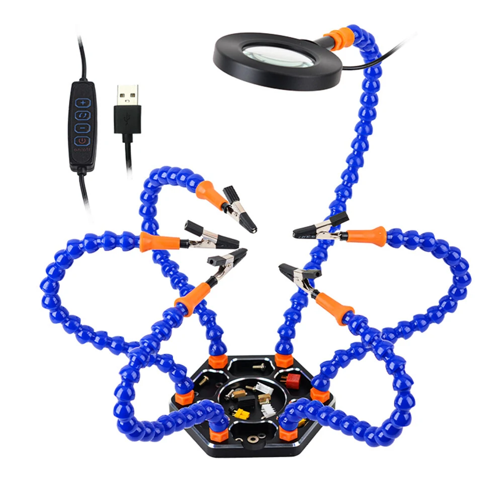 Descrição:Estação de solda de liga de alumínio com 6 garras e lupa USB. Uma solução de alta potência para trabalhos de precisão e hobbies.Funcionalidade:1. A soldagem rápida, eletrônica e projetos de faça você mesmo permitem que você termine seu trabalho mais rápido do que nunca! Nossos produtos facilitam o posicionamento com seis braços flexíveis.2. Braços flexíveis, cada um com um grande grampo jacaré giratório, o grampo pode ser removido, mais estável, evita que os grampos superaqueçam e caiam.3. Base de corte de precisão e lindamente anodizada em dourado4. Pontas de clipe de silicone para máxima resistência ao calor5. Pés removíveis para uma operação autônoma estávelIntegra-se perfeitamente com os suportes e bases da PanaviseEspecificação:Material base: Liga de alumínioComprimento do tubo de junta universal: 340 mm (clip jacaré incluído)Cor de base de liga de alumínio: PretoBraços flexíveis Cor: RoxoIlustração:1. Bandejas embutidas mais convenientes2. Uma chave inglesa pequena pode remover os braços3. Tapete de borracha, protege o chassis.4.6 clipes removíveis, mais estáveis e convenientes.Pacote incluído:1 x Base de liga de alumínio1 x Lupa1 x luz USB6 x Clips de jacaré6 x Tubo com junta universalFotos detalhadas: