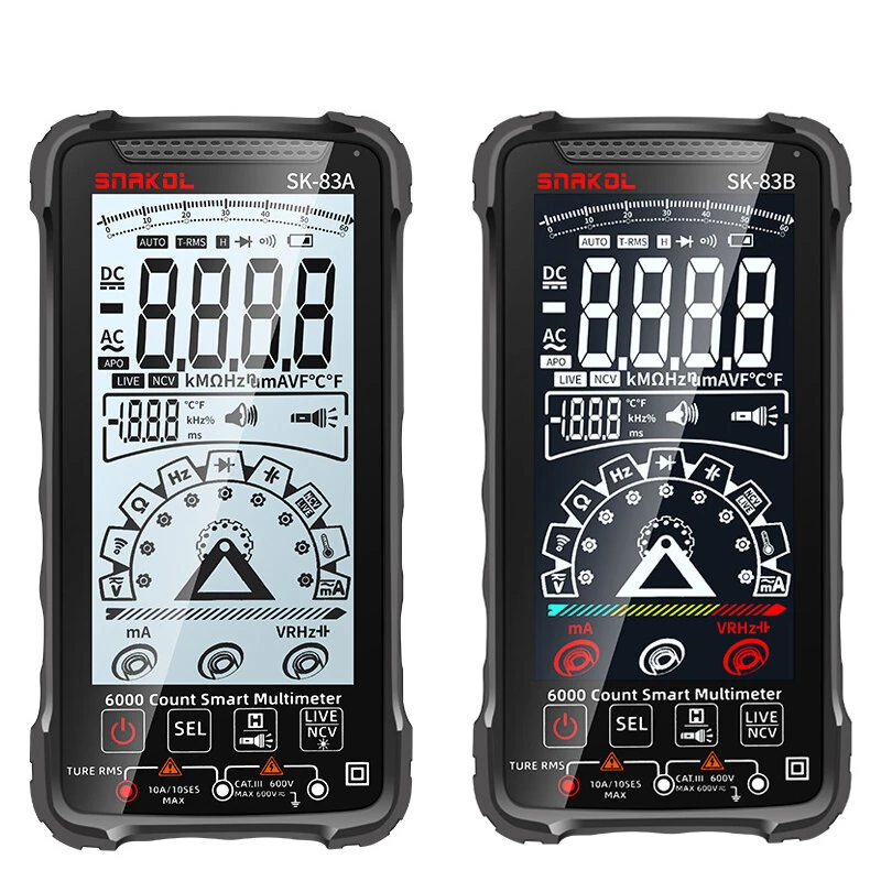 Özellikler:AC ve DC Voltaj: 0,001V~600VAC ve DC Akımı: 0.01A~10ADirenç: 0.1Ω~60MΩKapasitans: 0,01nF~60mFFrekans: 0.01Hz~6MHzSıcaklık: -20~1000℃Gösterim Sayısı: 6000Ağırlık: Yaklaşık 220gBoyutlar: 158X82X23mm Özellikler:SK-83A:Arka Aydınlatmalı LCD Ekran: Düşük ışık koşullarında okunması kolay ekran.Pil ile çalışır: Uzun süreli kullanım için 1.5V*2 AAA pilleri ile çalışır.Otomatik Aralık ve NCV: Otomatik aralık testi ve temassız voltaj ölçümü.Birden fazla işlev: Zero Fire Wire, diyot testi, açma-kapama bip sesi ve el feneri içerir.Veri Tutma & Otomatik Güç Kapatma: Okumalarınızı sıfırlayana kadar tutar ve enerji tasarrufu sağlar. SK-83B:Yansıtıcı LCD Ekran: Doğrudan güneş ışığı altında net veri görünürlüğü sağlar.Şarj edilebilir Lityum Pil: USB aracılığıyla şarj edilebilen uzun ömürlü lityum pil ile donatılmıştır.Otomatik Aralık ve NCV: Otomatik aralık testi ve temassız voltaj ölçümü.Ekstra Özellikler: Sıfır Ateş Teli,diyot testi,açma-kapama bip sesi,otomatik kapanma ve fener.Veri Tutma Fonksiyonu: Ölçümleri yakalar ve kolay referans için saklar. Paket içeriği:Tip A:1 x SK-83A Multimetre1 x Metre kutusu1 x Bez çanta2 x Metre kalemi1 x Sıcaklık probu1 x İngilizce/Çince kılavuz B Tipi:1 x SK-83B multimetre1 x Metre kutusu1 x Bez çanta2 x Metre kalemi1 x Sıcaklık probu1 x İngilizce/Çince kılavuz1 x USB şarj kablosu (Sadece SK-83B modeli için)