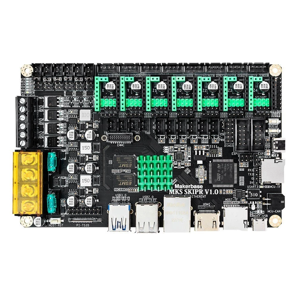 Klipper-Host perfekt ausführenMKS SKIPR ist eine von Makerbase eingeführte All-in-One-Platine zum Ausführen von Klipper. Sie integriert den SOC, auf dem der Klipper-Host läuft, und die MCU, die für die Ausführung bestimmter Maschinenaktionen verantwortlich ist. Es ist für die meisten 3D-Drucker geeignet. SOC verwendet Rockchips 4-Core Cortex-A53-Architektur RK3328 mit Armbian-System, worauf der Klipper-Host perfekt läuft. MCU verwendet STM32F407VET6 mit Cortex-M4-Architektur, 168 MHz Hauptfrequenz, einfache Steuerung verschiedener Maschinenaktionen. Umfangreiche Schnittstellen Behalten Sie die umfangreichen Schnittstellenressourcen von MKS PI bei: mit 1 GByte DDR3-Speicher, Unterstützung für HDMI-Bildschirmschnittstelle, PI-TS35-Bildschirmschnittstelle, kabelgebundenem Ethernet-Anschluss und 3-Wege-USB-Schnittstelle (kann extern an die Hauptsteuerplatine, USB-Drahtlosnetzwerkkarte, USB-Kamera, U-Disk, USB-Tastatur und -Maus usw. angeschlossen werden). Steuerbare Lüfter und sicherer Schutz Mit 3-Wege-steuerbaren Lüftern und 3-Wege-Schließerausgang können VIN, 12 V oder 5 V Spannung unabhängig voneinander ausgewählt werden. Ausgestattet mit Schottky-Diodenschutz für MOS-Schaltkreise und Temperaturmessschaltungen. Entwickelt mit der Gegen-EMK-Energieabsorptionsschaltung zum Schutz des Schrittmotortreibermoduls. Darüber hinaus kann die Z+-Schnittstelle die Spannungsauswahl unabhängig einstellen, um sie an verschiedene PROBE-Modelle anzupassen. Weitere Funktionen: Unterstützt das Booten des Systems von der TF-Karte und dem EMMC-Modul (das EMMC-Modul ist stabiler als die TF-Karte und hat eine schnellere Lese- und Schreibgeschwindigkeit); unterstützt 7-Achsen-Schrittmotorantrieb, um die Anforderungen der meisten 3D-Druckermodelle zu erfüllen; 3 unabhängige MP1584PEN DC/DC-Module bieten eine starke Garantie für den stabilen Betrieb der gesamten Platinenschaltung.