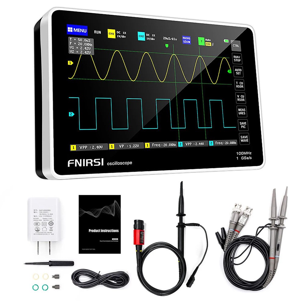 Professionell gestaltetes FNIRSI-Oszilloskop verfügt über eine Echtzeit-Abtastrate von bis zu 1 GSA/S und eine analoge Bandbreite von 100 MHz 2. Das Fnirsi-Oszilloskop verfügt über eine vollständige Triggerfunktion (einzeln/normal/automatisch) und kann sowohl für periodische analoge Signale als auch für aperiodische digitale Signale frei verwendet werden. Hohe Leistung 7 Zoll, 800 480 Auflösung, helle Farben und hoher Kontrast. Ultradünn und leicht zu tragen. Eingebautes Hochspannungsschutzmodul verträgt eine Dauerspannung von bis zu 400 V. Der 6000 mAh Hochleistungs-Lithium-Akku kann nach vollständigem Aufladen 4 Stunden lang ununterbrochen verwendet werden. Einfach zu bedienen Ausgestattet mit einem effizienten Ein-Knopf-Automatikgerät. Wellenformspeicherung und Screenshots mit einem Klick. Der eingebaute 1 GB Speicherplatz kann bis zu 1000 Screenshots und 1000 Sätze von Wellenformdaten speichern. Der leistungsstarke Wellenform-Bildmanager unterstützt das Durchsuchen, Anzeigen und Detailanzeigen von Miniaturansichten, Umblättern, Löschen und Vergrößern, Verkleinern und Verschieben von Wellenformen usw. Einfache Messung: Kapazitive Bildschirm-Touch- und Gestenbedienung, Cursor-Messfunktion. Beim manuellen Lesen von Amplituden-Frequenz-Parametern müssen Sie die Maßstabeinheit und -menge im Hintergrund nicht lesen und können den Spitze-Spitze-Wert und die Frequenz ohne Konvertierung direkt abrufen. Lissajous-Grafikanzeige und FFT-Anzeige: Mit der Lissajous-Grafikanzeigefunktion können Amplitude, Frequenz und Phase der beiden Signalsätze verglichen werden. Mit der FFT-Anzeigefunktion lässt sich der harmonische Inhalt des Signals grob abschätzen.