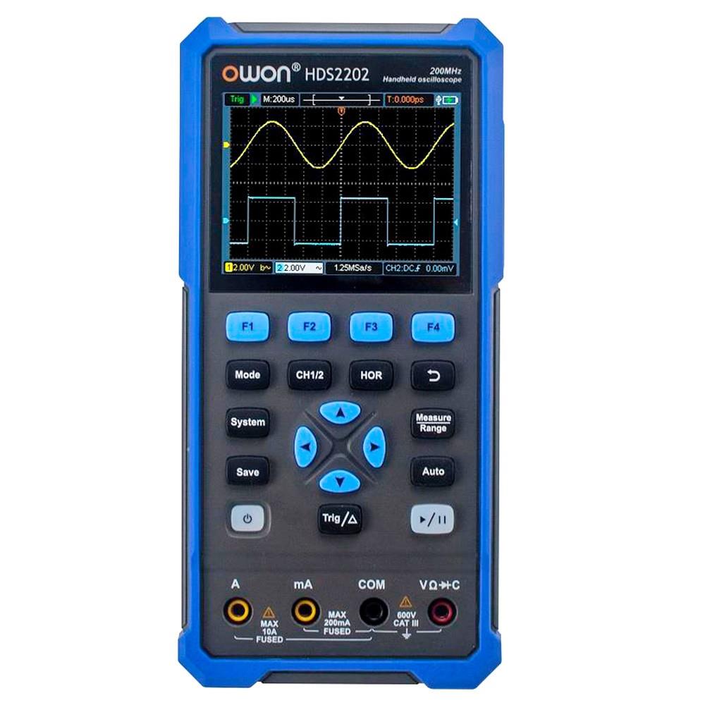 2-in-1-HandoszilloskopOWON HDS2202 verfügt gleichzeitig über eine digitale Oszilloskopfunktion und eine Multimeterfunktion. Es ist einfach zu bedienen und eignet sich für die Wartung im Freien, schnelle Messungen vor Ort, Autowartung, Leistungserkennung usw. Digitale OszilloskopfunktionenVerfügt über einen Zweikanaleingang, 200 MHz Bandbreite, 1 GSa/s Echtzeit-Abtastrate und eine maximale Aufzeichnungslänge von 8 KB. Es verfügt außerdem über eine Cursor-Messfunktion und eine automatische Ein-Tasten-Einstellfunktion, die leicht zu erkennen und zu debuggen ist.MultimeterfunktionenDas True-RMS-Multimeter mit 20000 Zählungen verfügt über eine automatische Bereichswahlfunktion und eine Messwerthaltefunktion. Es kann zur Messung von Standardspannung, Strom, Widerstand, Diode, Kapazität und Durchgangsprüfung verwendet werden. Es konfiguriert eine maximale Eingangsspannung von AC 750 V und DC 1000 V. Unabhängiger Eingang von Multimeter und Oszilloskop unterstützt die relative Messfunktion.