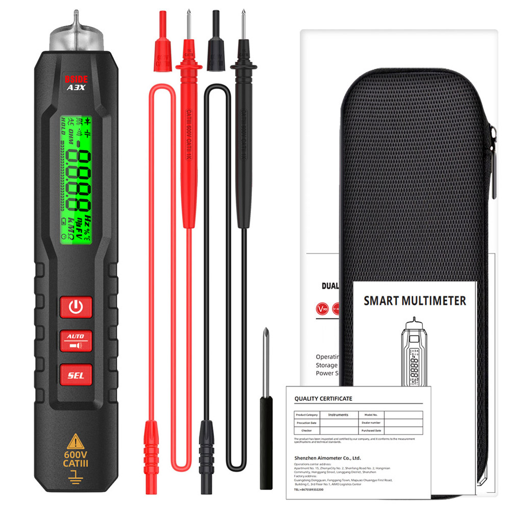 1. Elektrischer Stiftstrommultimeter 3-in-1-Funktion elektrischer Stift + Stromzange + Multimeter.2. Die Stromversorgung über Lithiumbatterien ist praktisch und hält länger.3. Der Stromsensor unterstützt den Bereich von 0,5 bis 100 Ampere, kann Wechsel- und Gleichströme automatisch erkennen und kann auch manuell umgeschaltet werden.4. Unterstützt den manuellen DC-Nullmodus.5. Unterstützt die automatische Erkennung von Spannung/Widerstand/Ein/Aus.6. Die Multimeterfunktion unterstützt Spannung, Widerstand, Ein/Aus, Diode, Kapazität, Frequenz, Arbeitszyklus, Temperatur.7. Berührungsloses Testen von Strom und berührungslose Erkennung von Wechselspannung (Modus mit niedriger Empfindlichkeit).8. Nachtlichtfunktion.9. Unterstützt das Ein- und Ausschalten der automatischen Ausschaltfunktion.