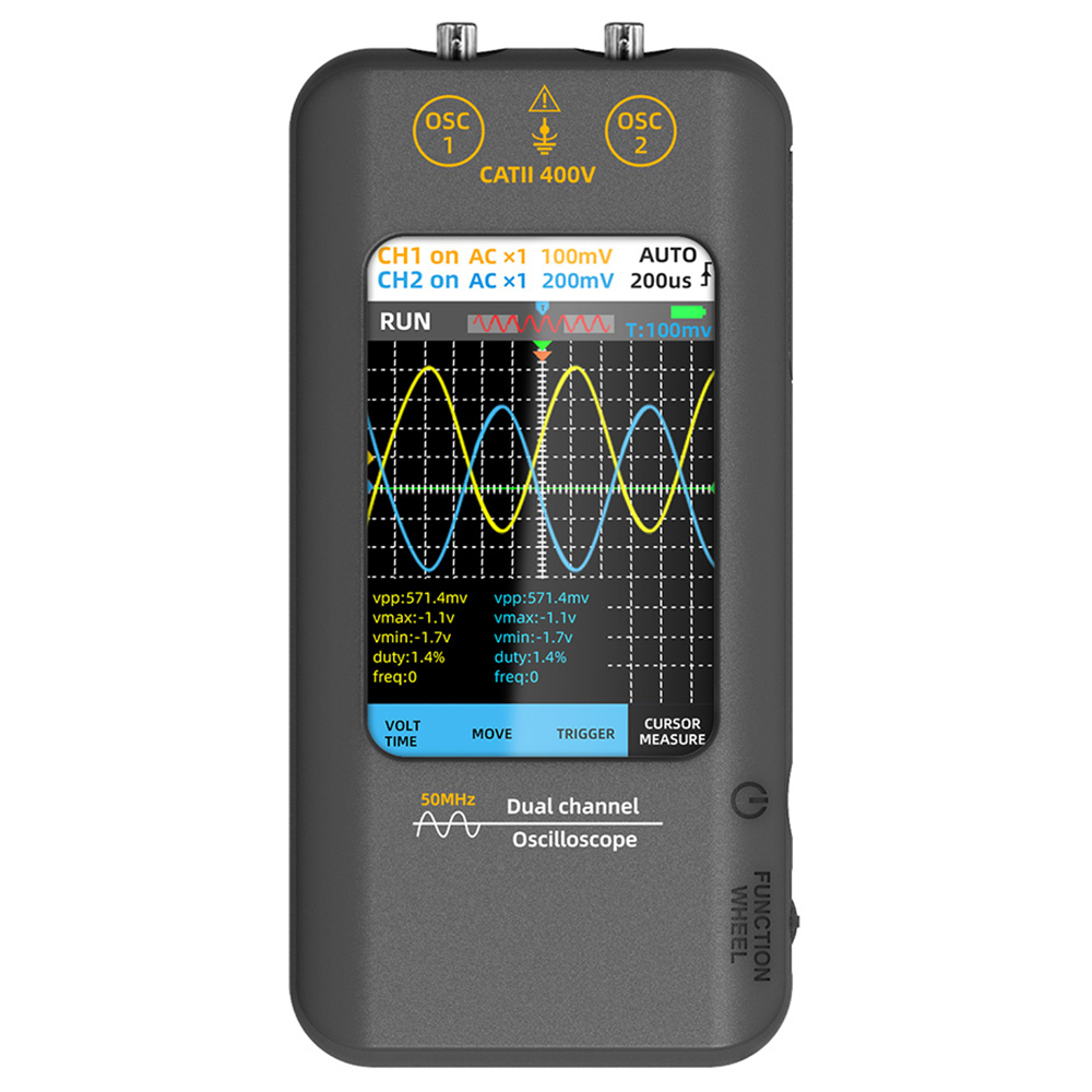 Zweikanalige EchtzeitabtastungUnterstützt zweikanalige DC- und AC-Echtzeitabtastung mit einer Bandbreite von 50 MHz und einer Abtastrate von 250 MSa/s.Komfortabler TouchscreenAusgestattet mit einem 3,98-Zoll-TFT-LCD-Touchscreen, der eine benutzerfreundliche Oberfläche für einfache Navigation und Bedienung bietet.Vielseitiger WellenformgeneratorEingebauter Signalgenerator, der Sinus-, Rechteck-, Dreieck- und Sägezahnwellen mit einem Frequenzbereich von 0 Hz bis 2 MHz unterstützt.Datenspeicherung und Warnung bei niedrigem BatteriestandBeinhaltet Datenspeicherungsfunktion, Warnung bei niedrigem Batteriestand, automatische Abschaltung und Bildschirmhintergrundbeleuchtung für verbesserte Benutzerfreundlichkeit.
