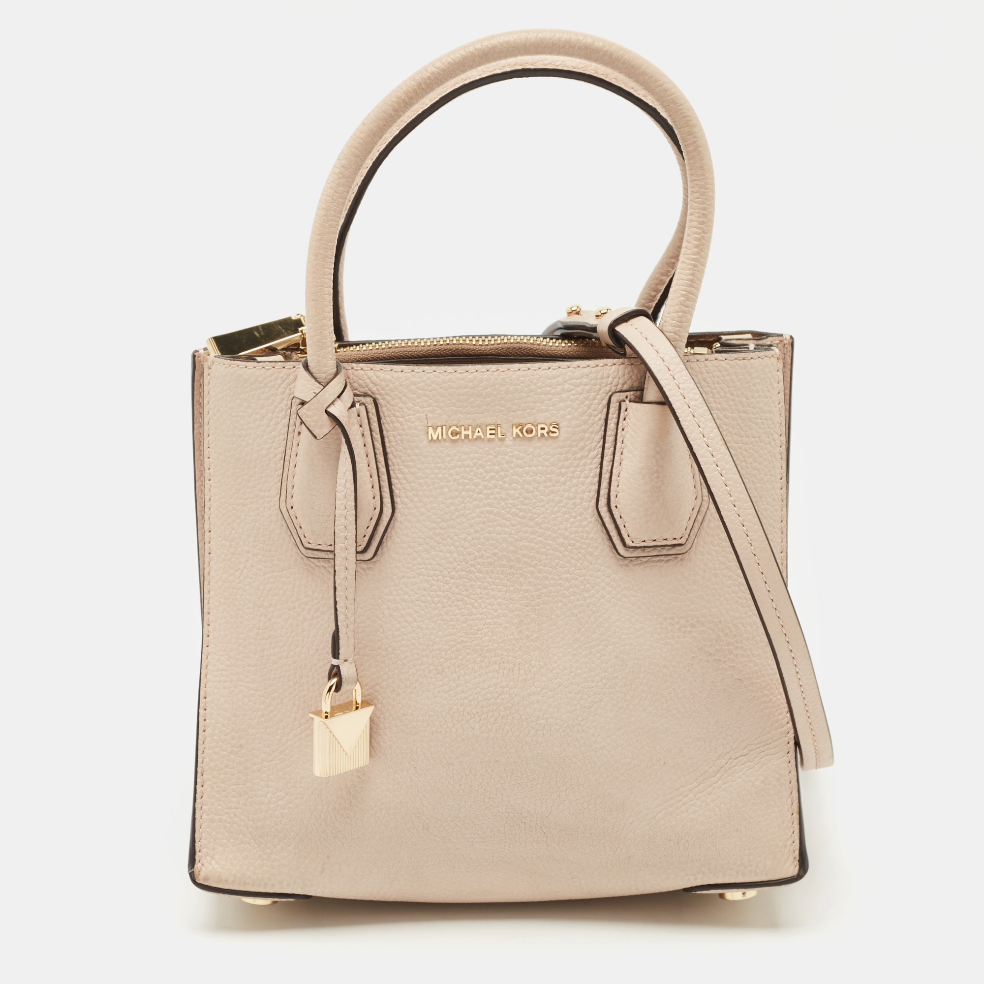 Elegant style and utility combine to form this Mercer bag from the house of Michael Kors. Crafted using light pink leather, the mini tote features the brand logo on the front, a lined interior, two handles, and a shoulder strap.