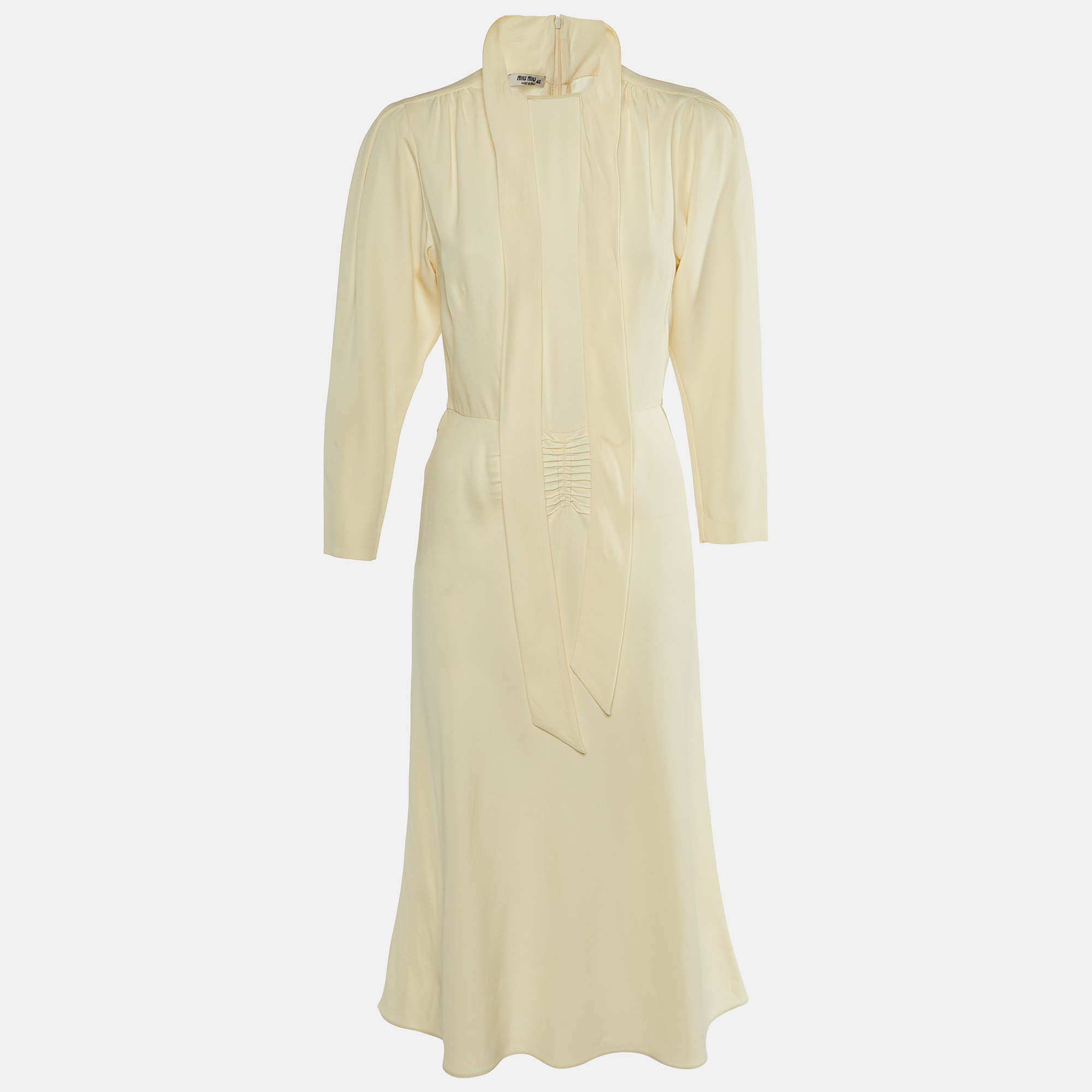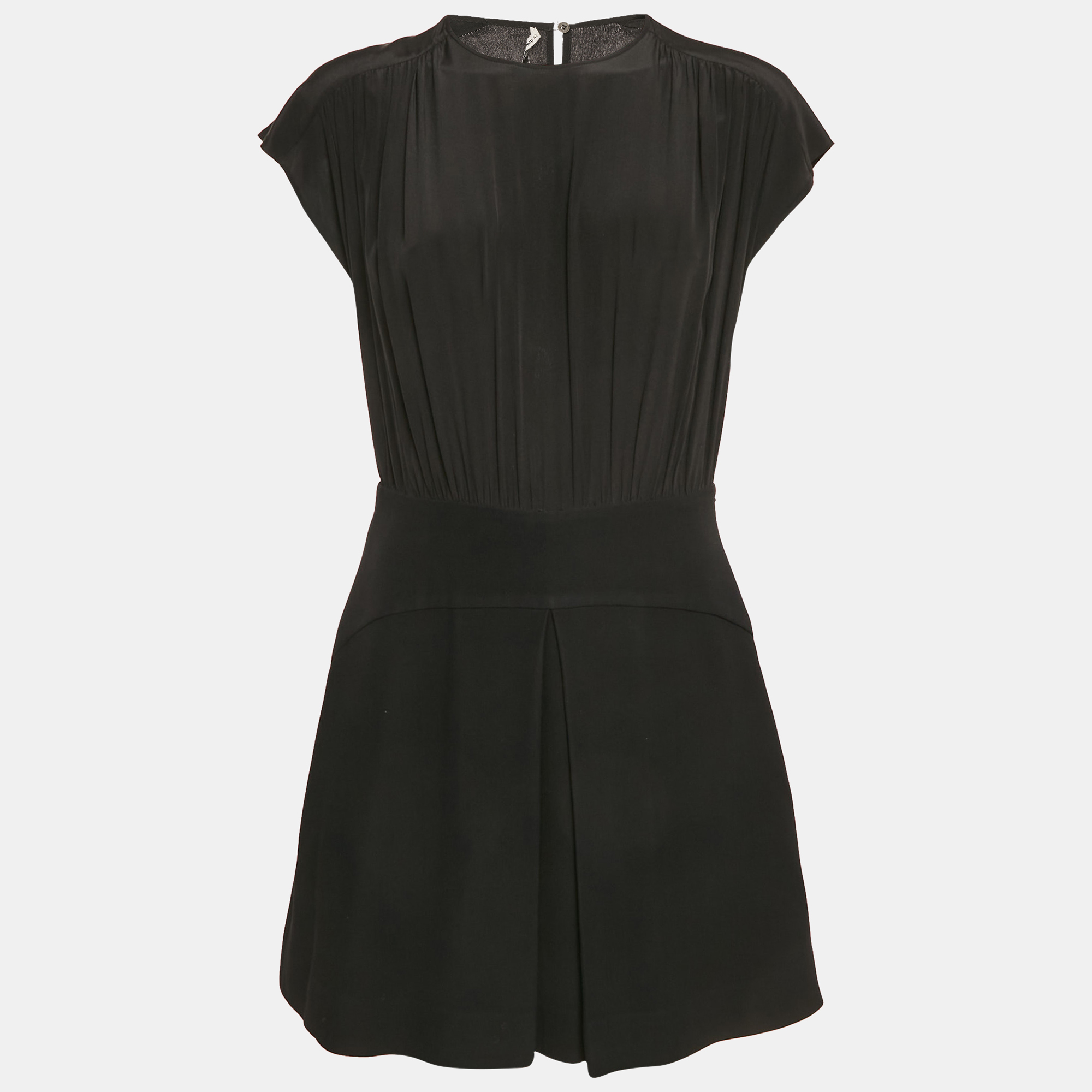 This Miu Miu mini dress is crafted from crepe and wool, designed with soft gathering that adds depth to its sleek black silhouette. The feminine structure and clean neckline offer understated elegance—ideal for both polished daytime affairs and chic evening transitions.