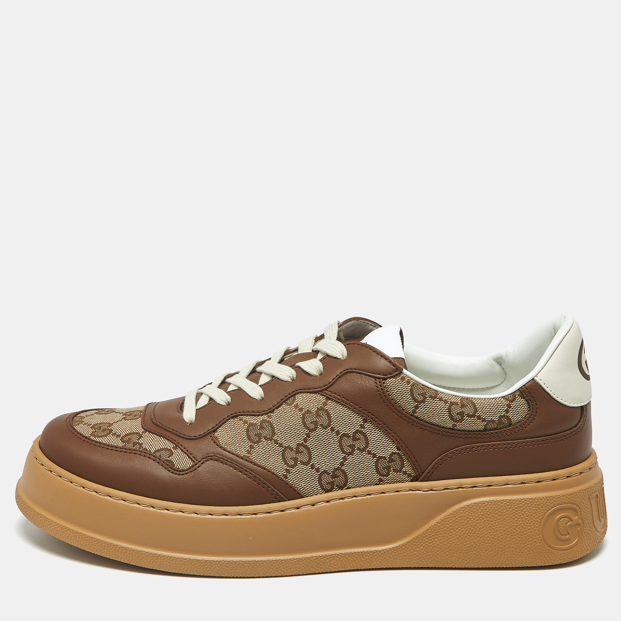 The mix of canvas monogram and brown leather on these Gucci sneakers gives them a retro street look you don’t see every day. The raised sole brings a bit of attitude and shifts the proportions in a cool, unexpected way. Lace them up when you want something easy to wear that still shows a clear nod to classic Gucci style.