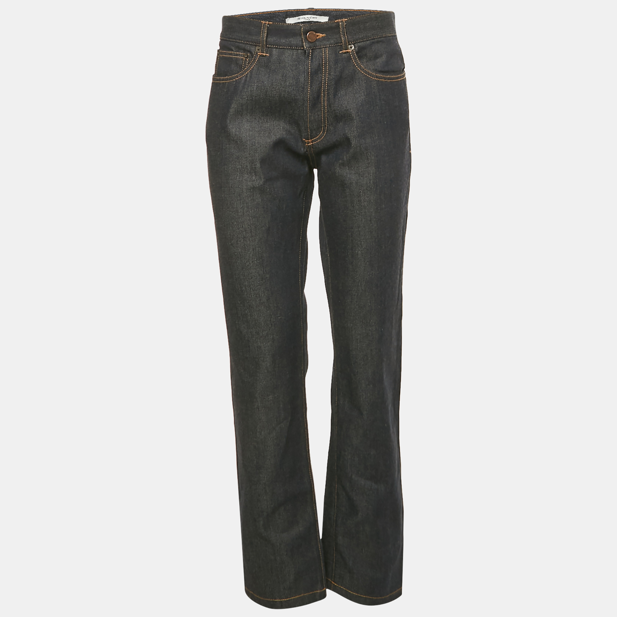 These dark denim jeans from Givenchy feature distinctive leather trimmed pockets, blending utilitarian edge with classic structure. The mid rise silhouette and clean tailoring make them ideal for transitional styling with elevated basics or bold outerwear.