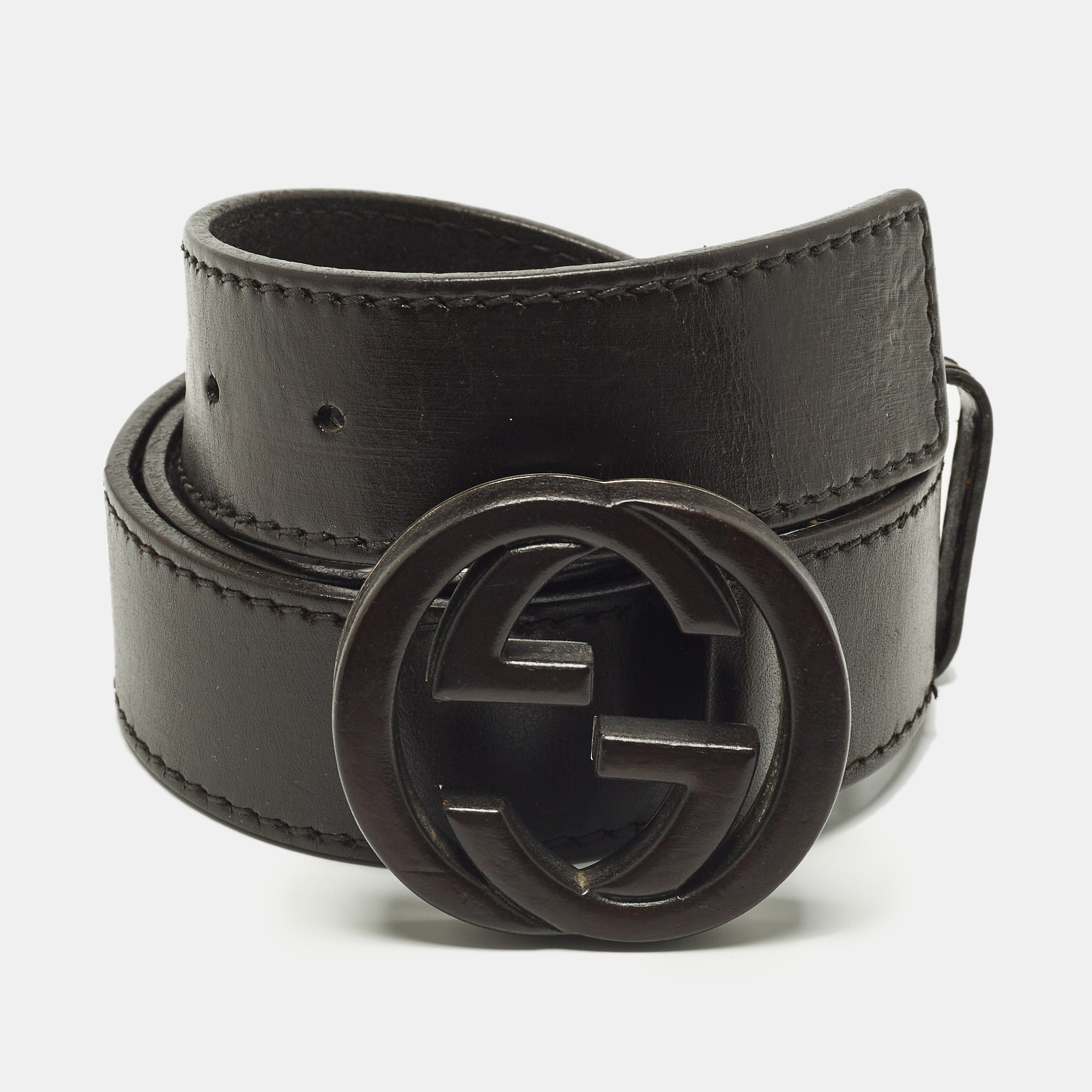 This Gucci belt is made from dark brown leather and measures 85 cm in length. It features the Interlocking G buckle in a matching finish with a clean, classic shape. Designed for everyday wear with jeans or tailored trousers.