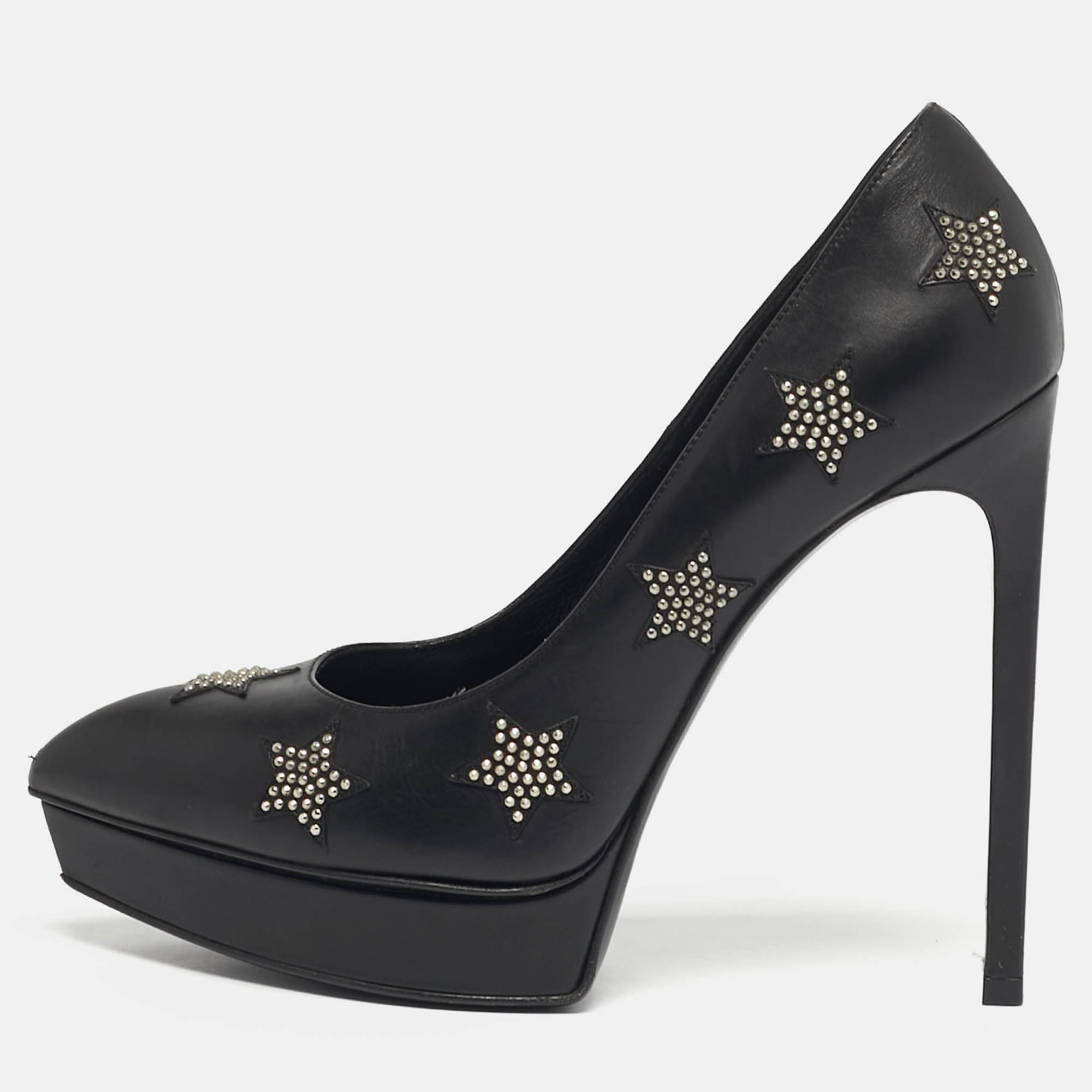 Star shaped studs scatter across smooth black leather, giving these Saint Laurent Paris pumps a sharp, night ready personality. The tall heel and slight platform create a confident rise that works well for evenings when you want something striking yet familiar in feel.