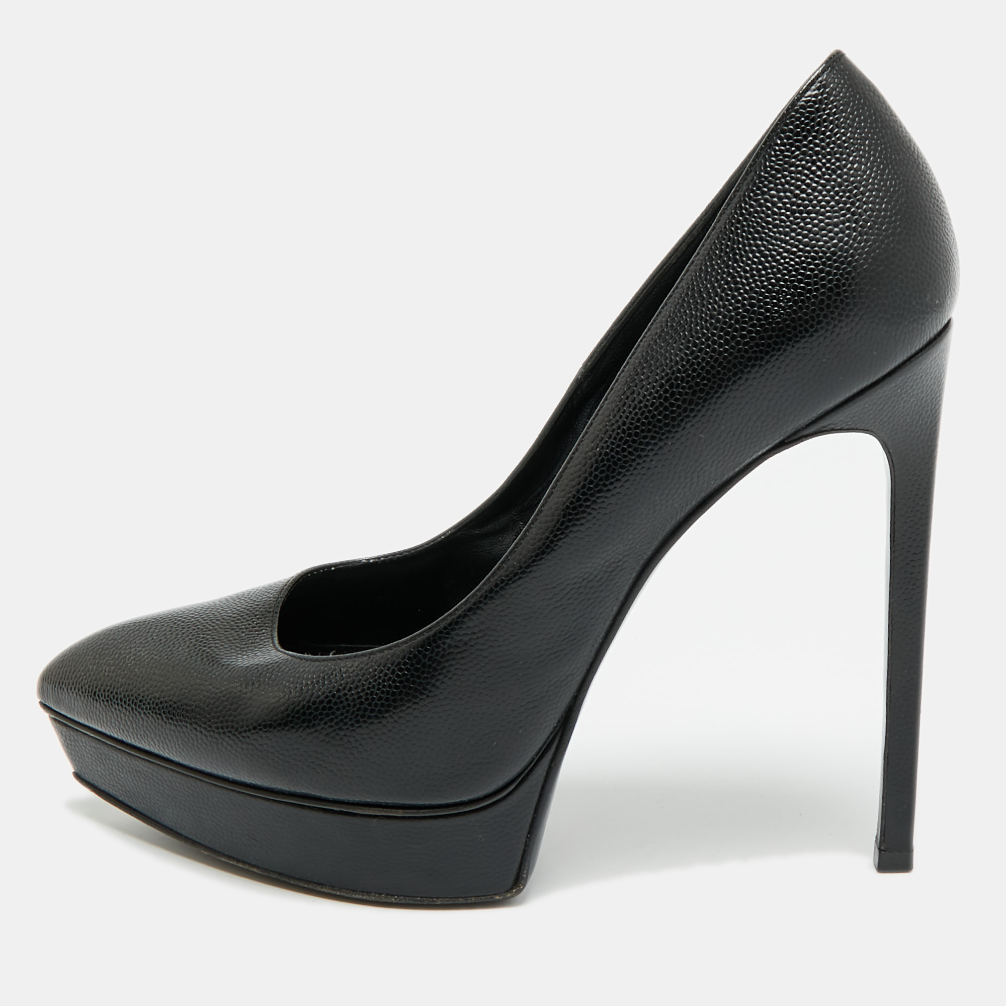 Saint Laurent frames these pumps with a smooth navy leather that gives them a refined, evening ready feel. The rounded toe and high platform lift the silhouette while still keeping the shoe steady for nights out, events, or any moment you want height with confidence.