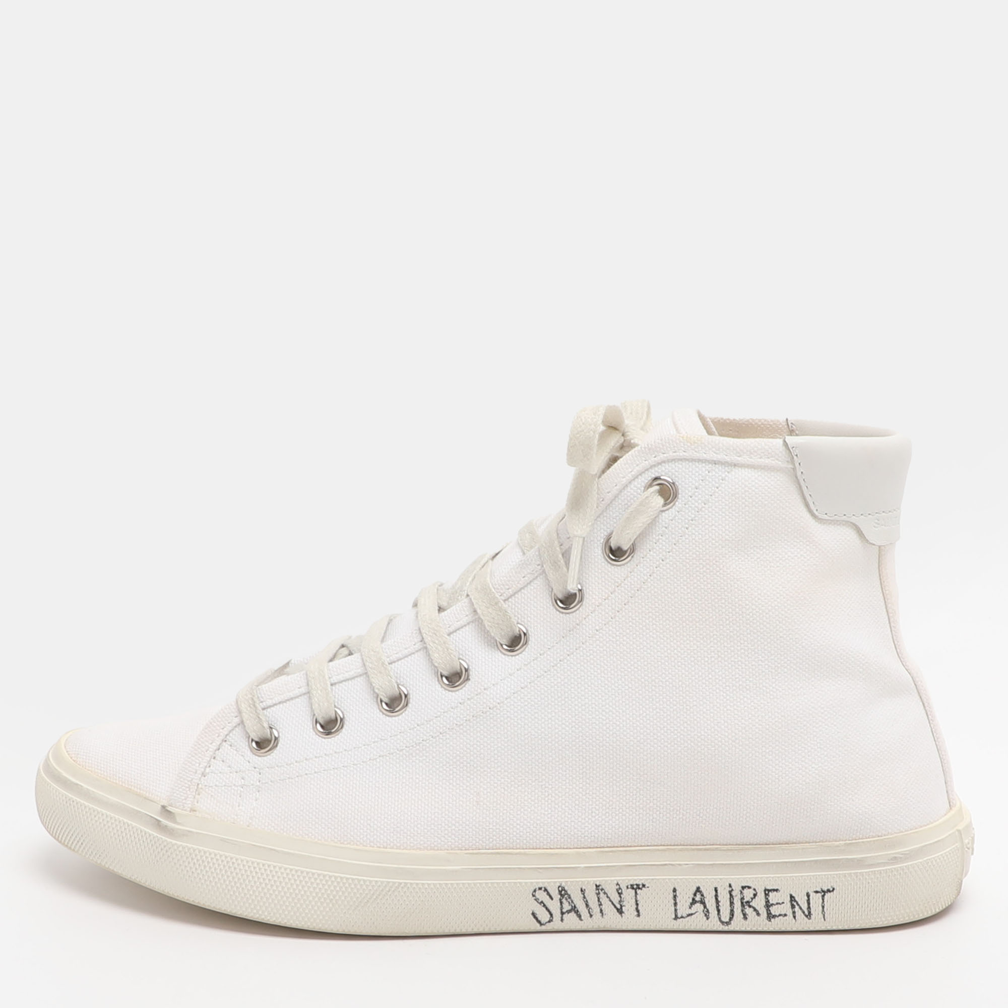 These Saint Laurent Malibu sneakers are crafted in white canvas and designed with a high top silhouette. Suitable for casual wear, they pair easily with denim or relaxed tailoring. A classic sneaker style that delivers versatility and effortless everyday appeal.