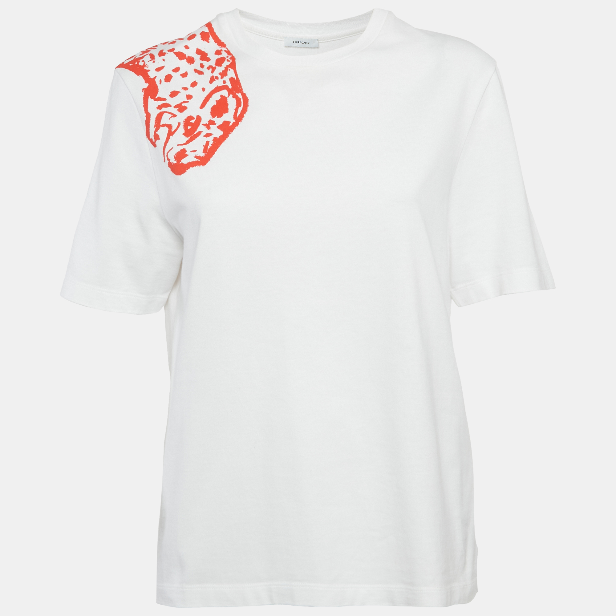 Clean white cotton meets a red leopard print on one shoulder. This Ferragamo T shirt is expressive yet wearable—easy to style when you want something more interesting than a plain tee.